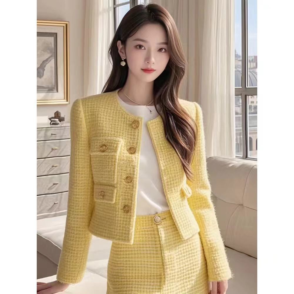 2025秋冬新款奶油黄华夫格别致小香风上衣外套半身短裙两件套