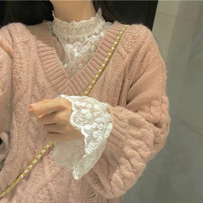底レースの長袖の網の糸の精巧な中にレースの底のシャツの女性の秋冬の洋風の上着のレースの小さいシャツの女性を掛けます。