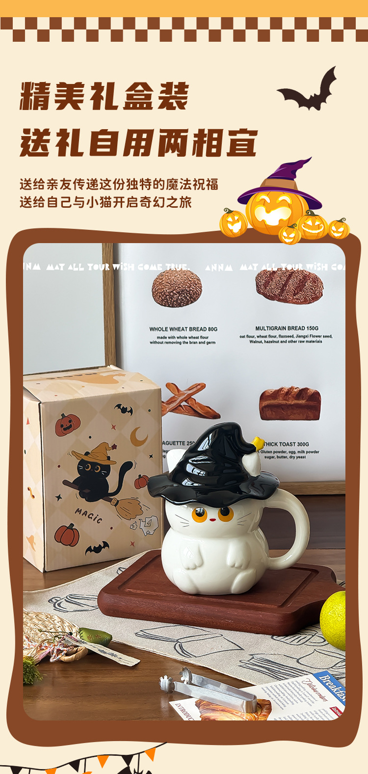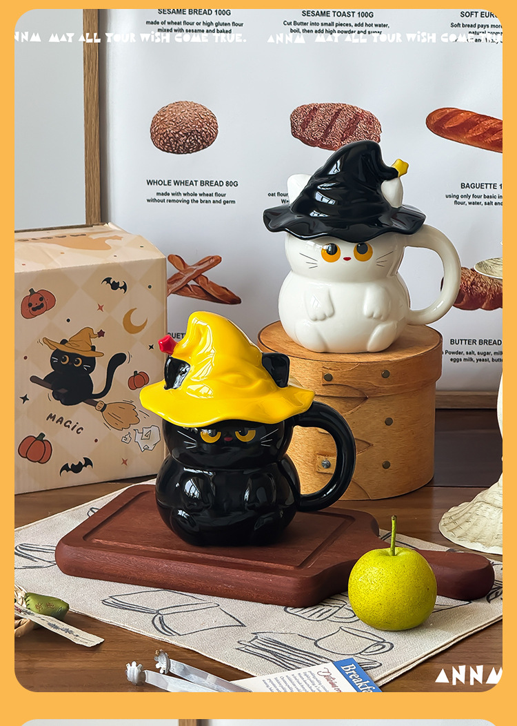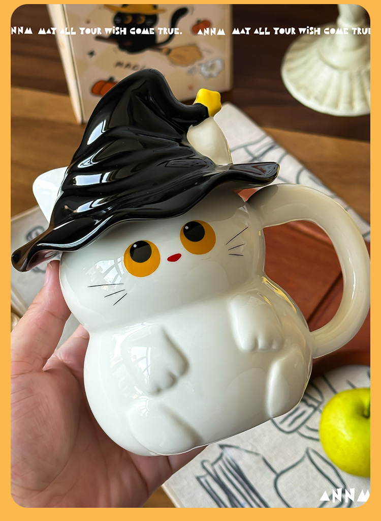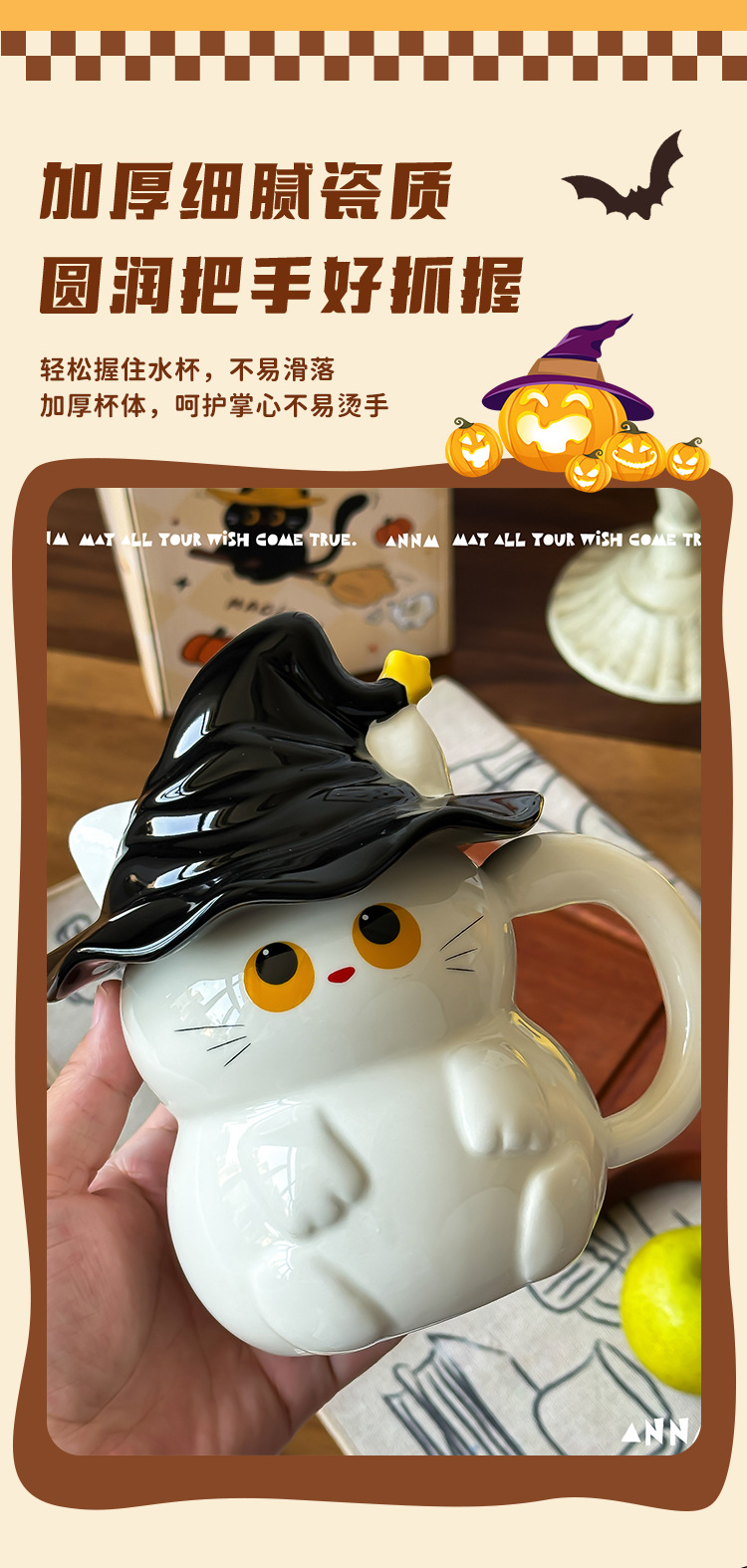 万圣节礼物魔法帽猫咪水杯女生高颜值陶瓷马克杯带盖杯子家用喝水