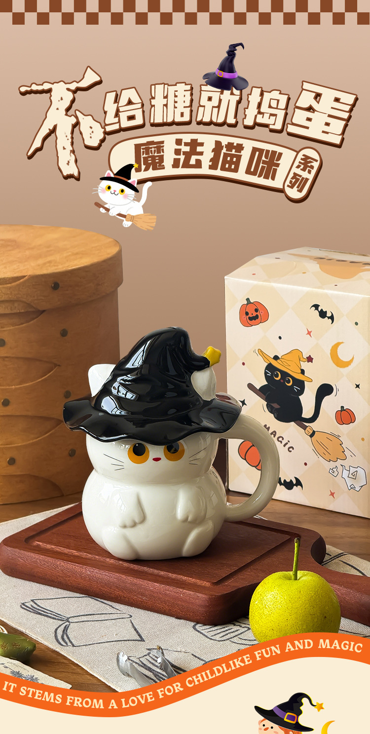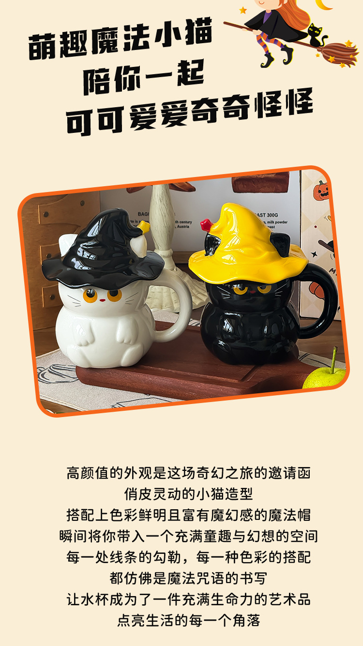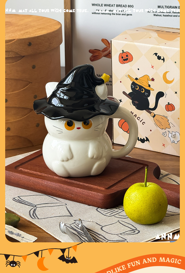万圣节礼物魔法帽猫咪水杯女生高颜值陶瓷马克杯带盖杯子家用喝水