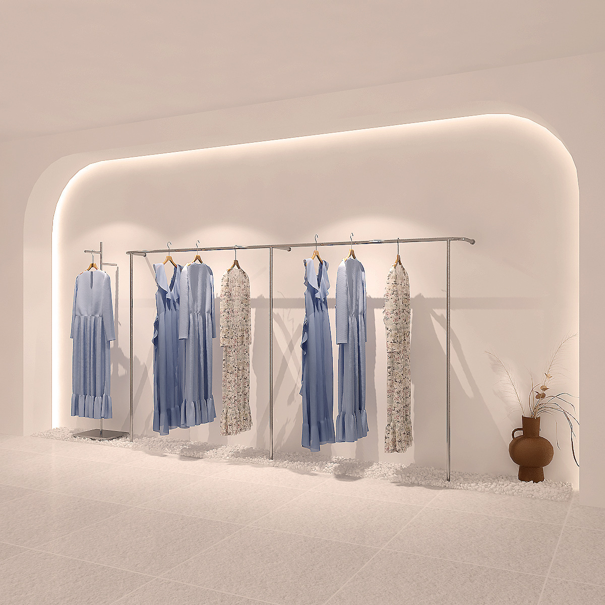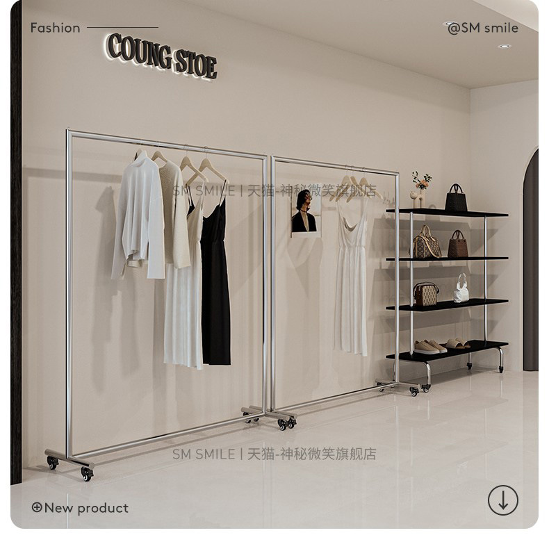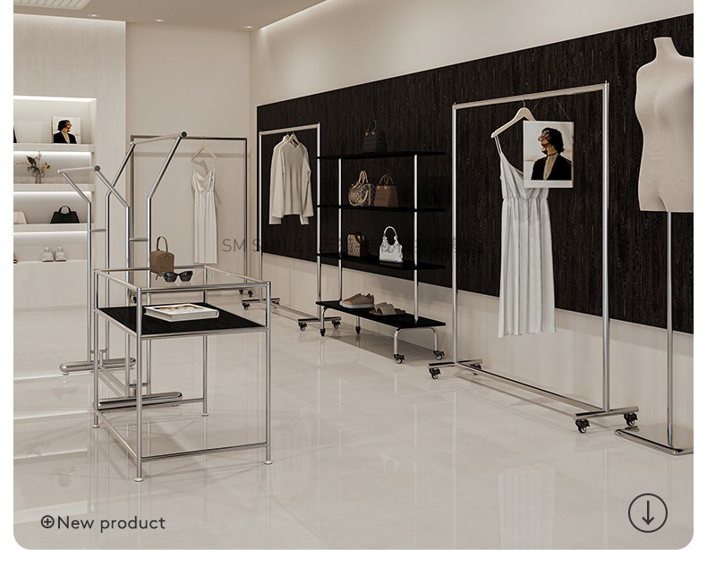 衣料品店のステンレス展示棚の新型プーリは婦人服店の床置き棚のファッション的でシンプルな棚の陳列をオススメします。