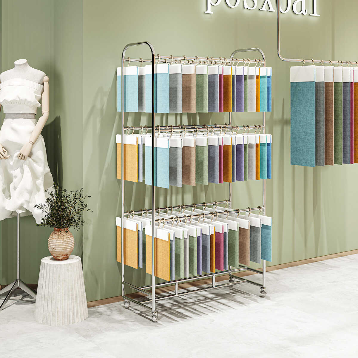 移動可能なステンレス製伸線銀生地サンプル多層両面織物サンプル生地テンプレート吊りカード展示棚