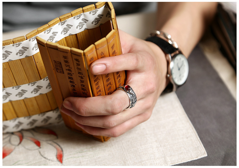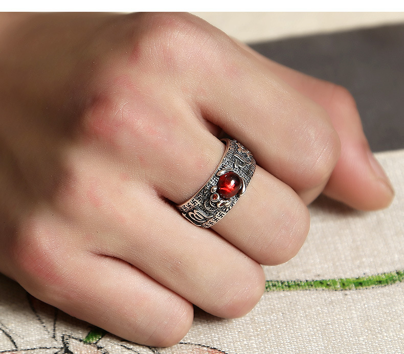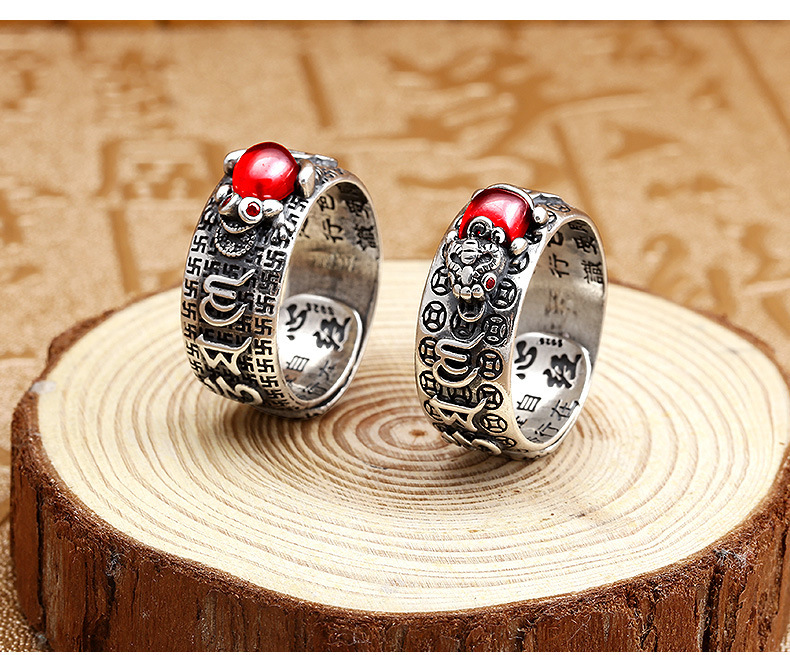 新品レトロメンズタイシルバー貔貅ルビーリング無垢シルバー金剛杵六字真言般若心経開口指輪