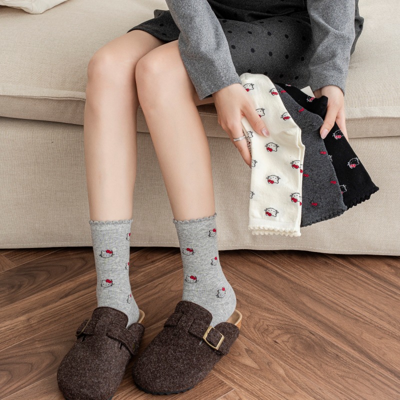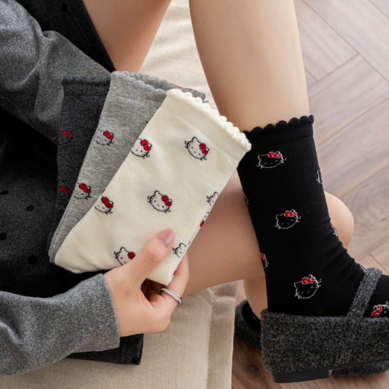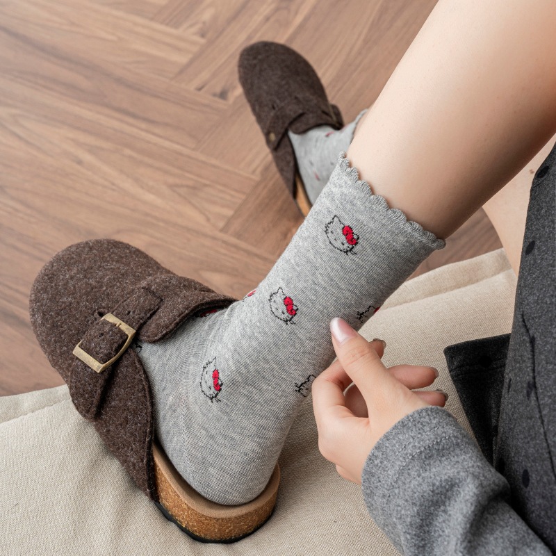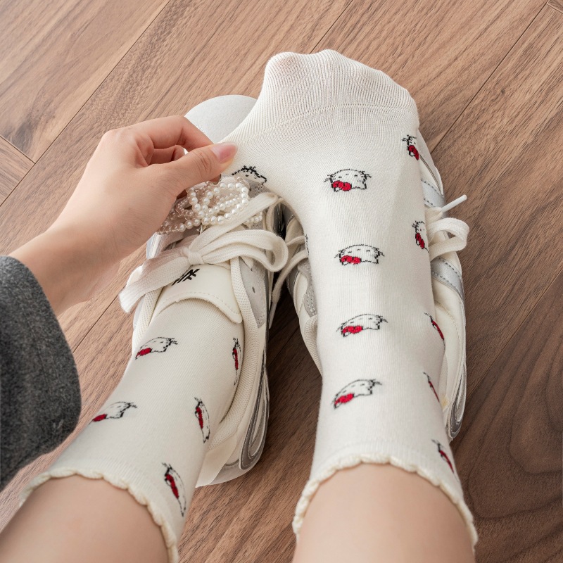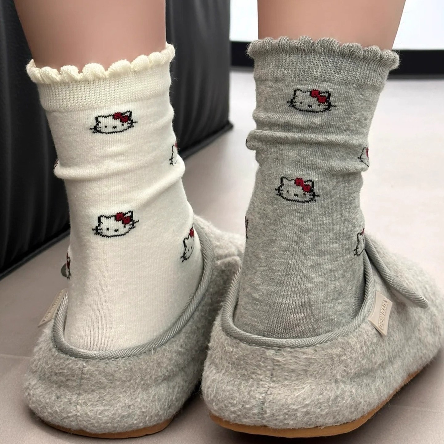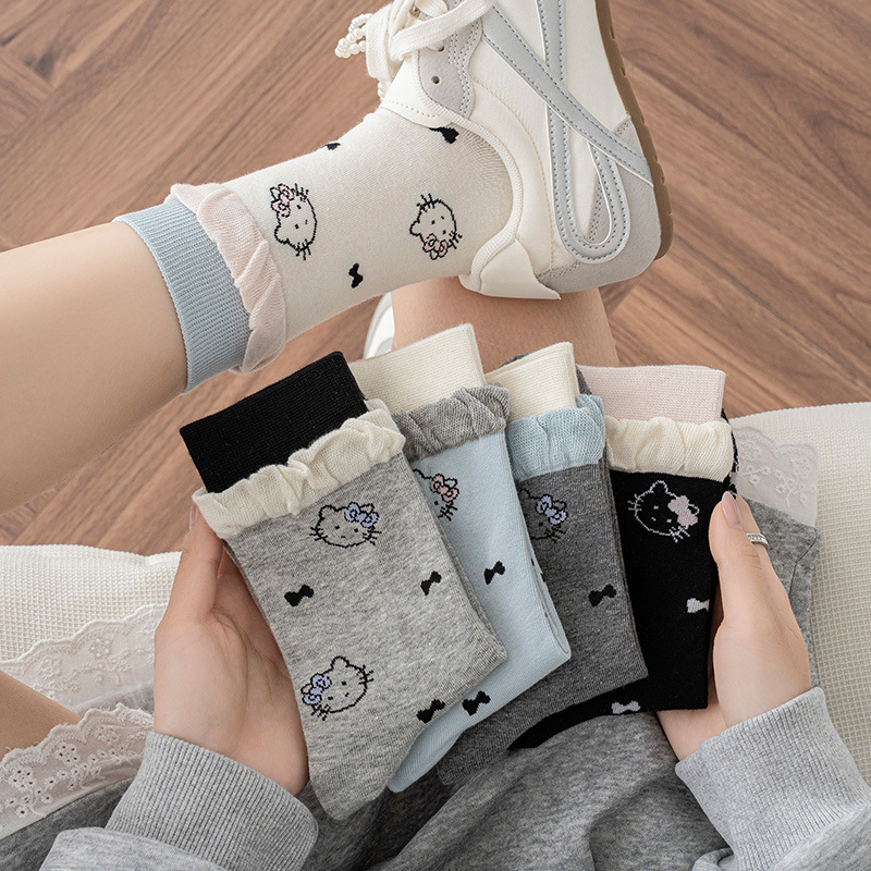 秋冬新款泡泡口木耳边卡通猫中筒袜女猫咪提花无骨透气百搭潮袜子