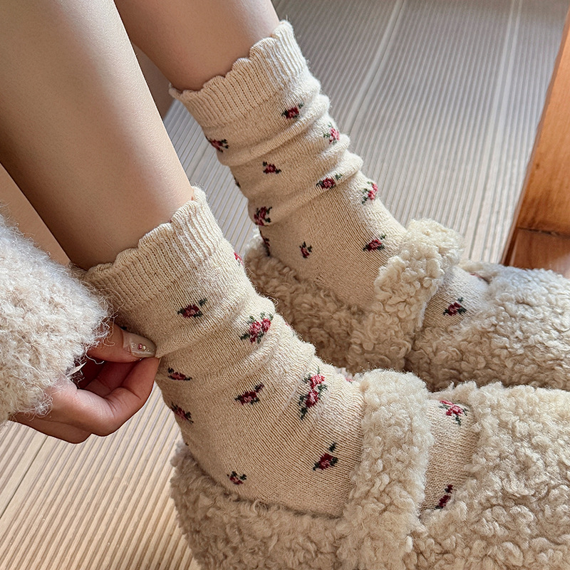 羊毛袜子女花边堆堆袜秋冬季加绒加厚保暖可爱小碎花羊绒中筒袜女