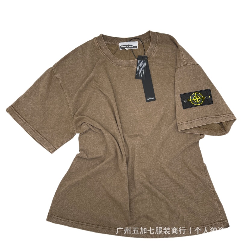 トレンディなブランド夏メンズラウンドネック半袖ウォッシュレトロダメージコットン無地 Tシャツストーン 2025 新しいカジュアル