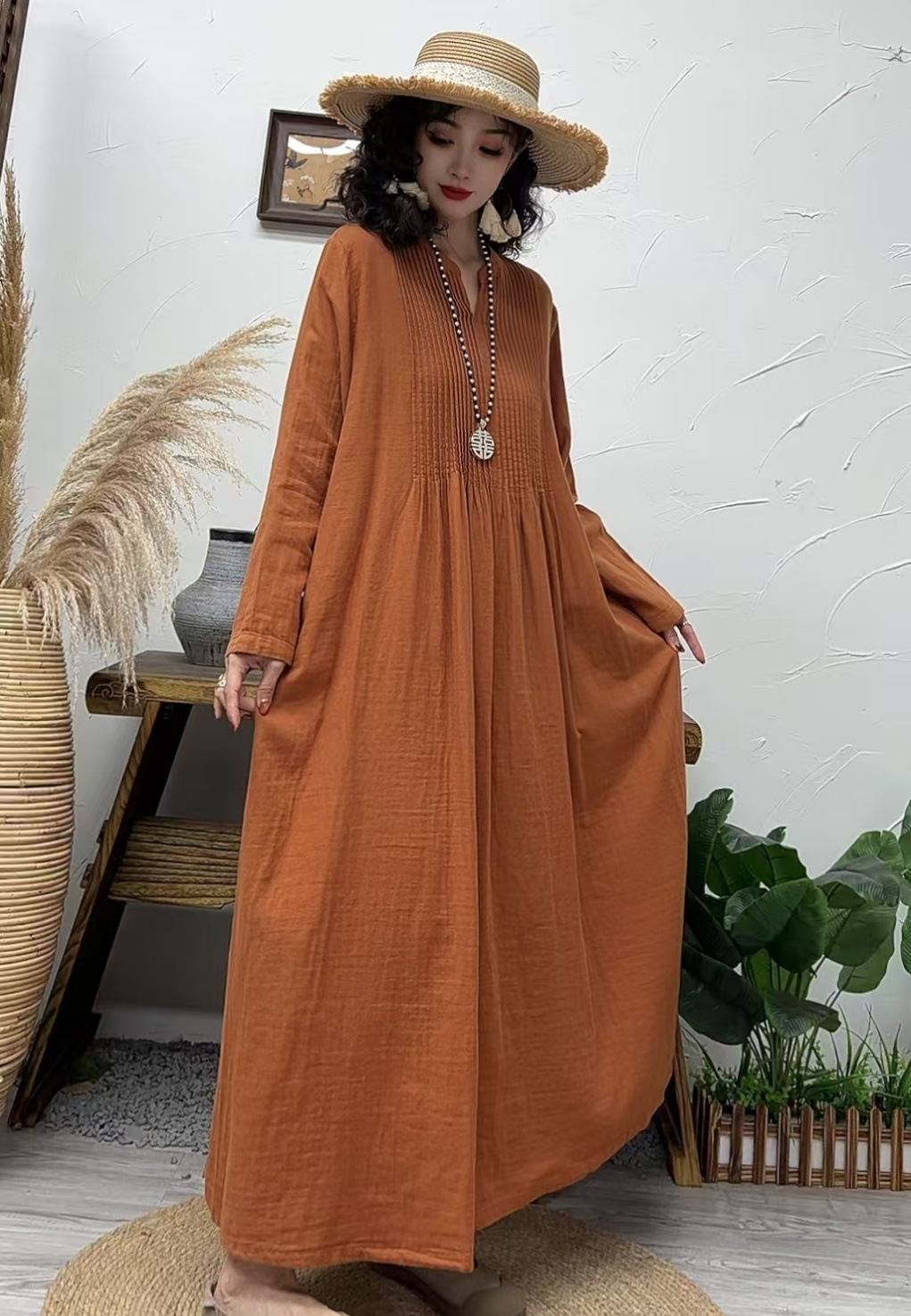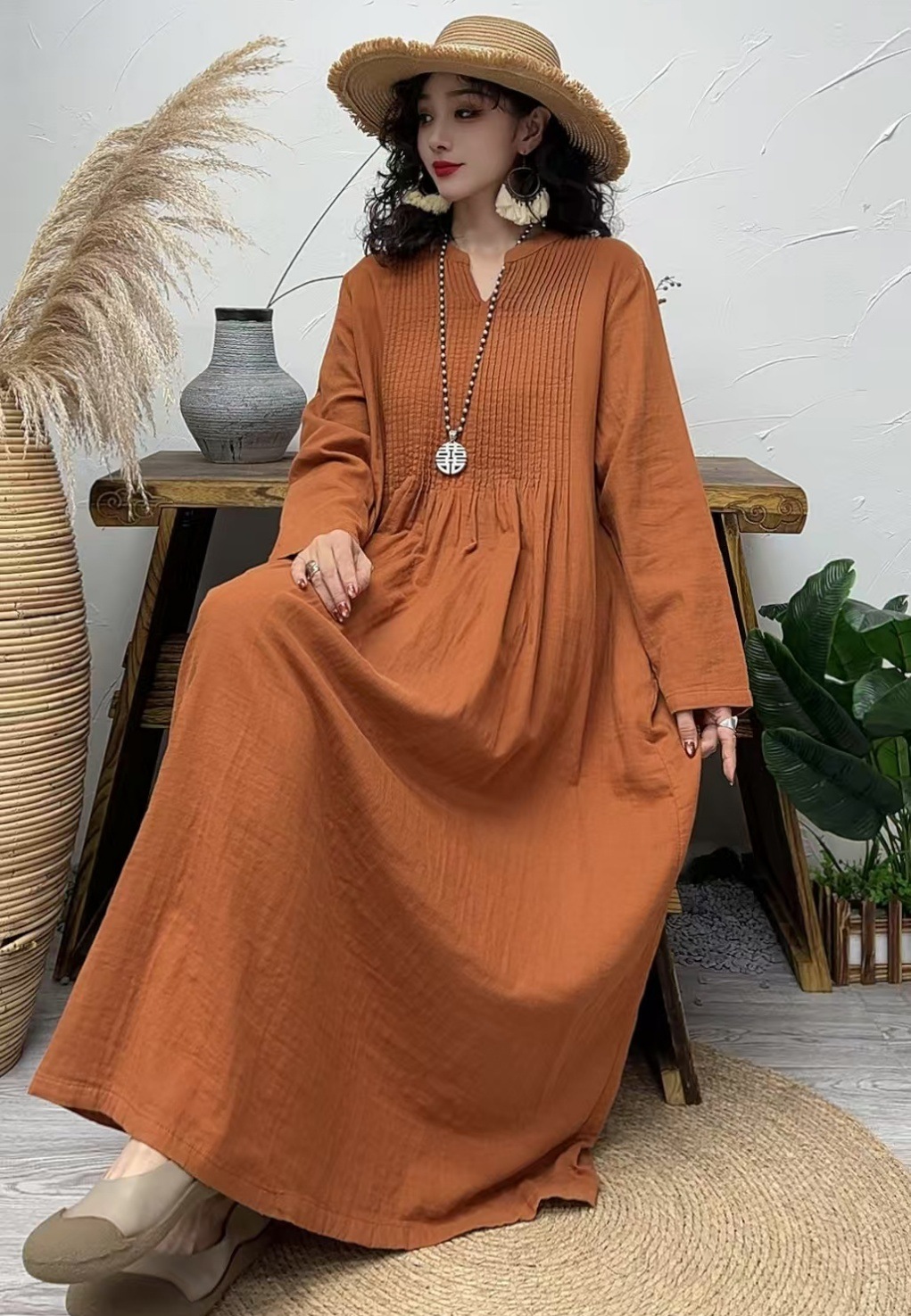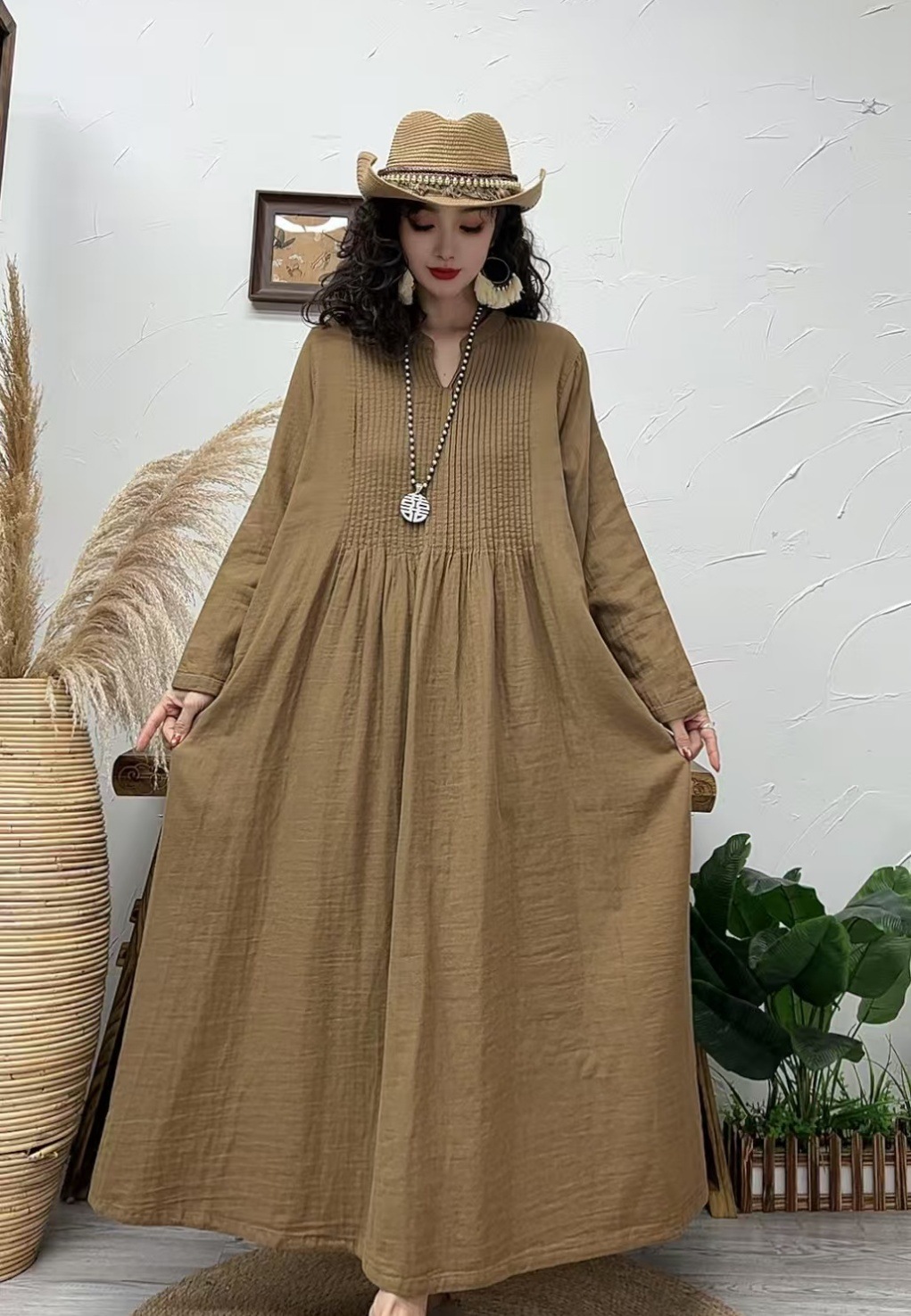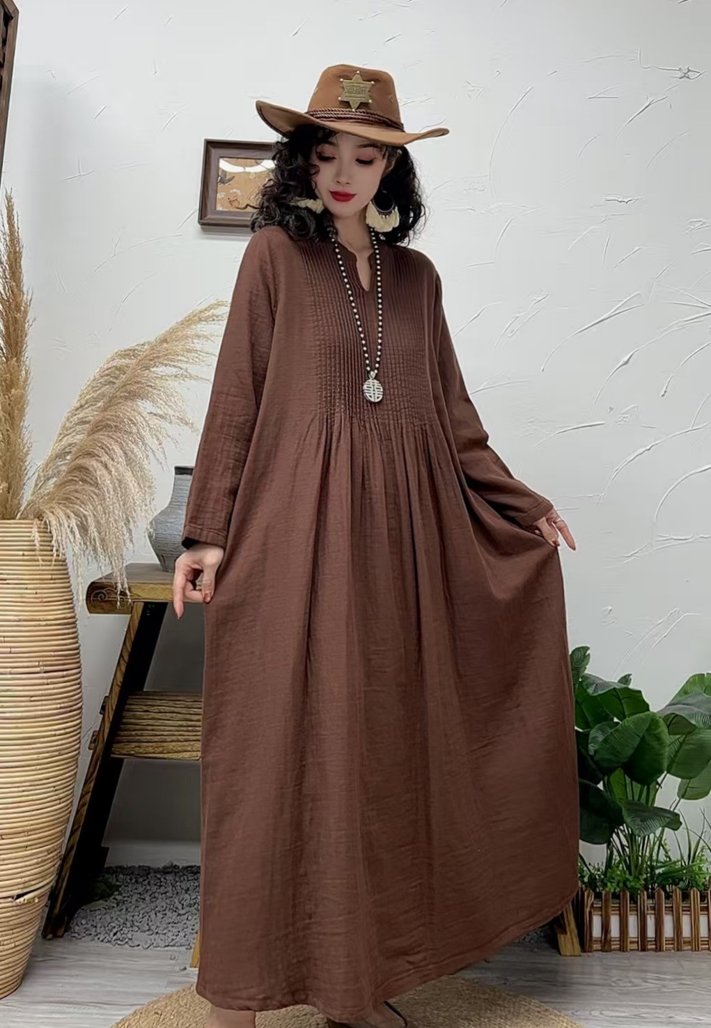 棉麻连衣裙文艺复古休闲风琴褶设计款长裙秋季新款长袖过膝大摆裙