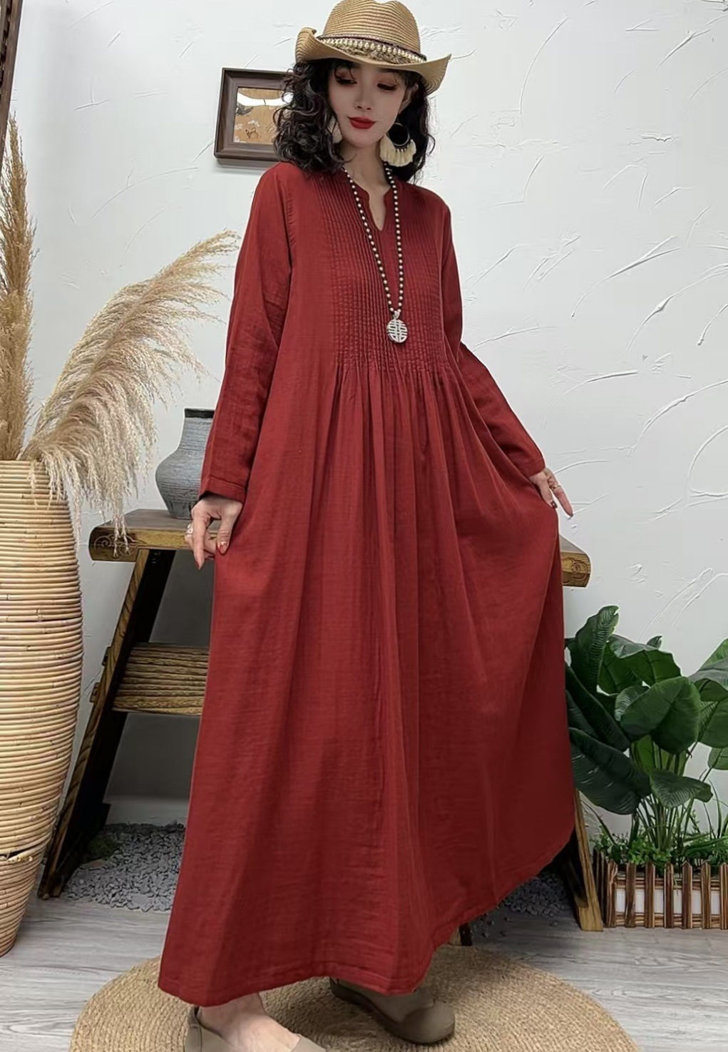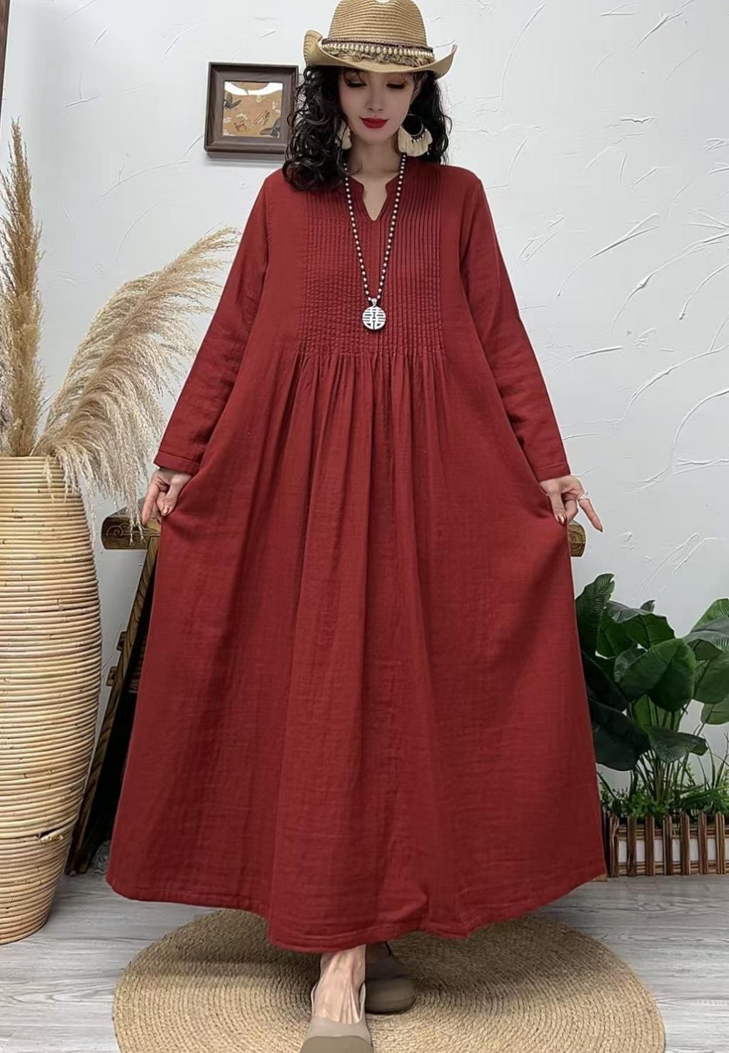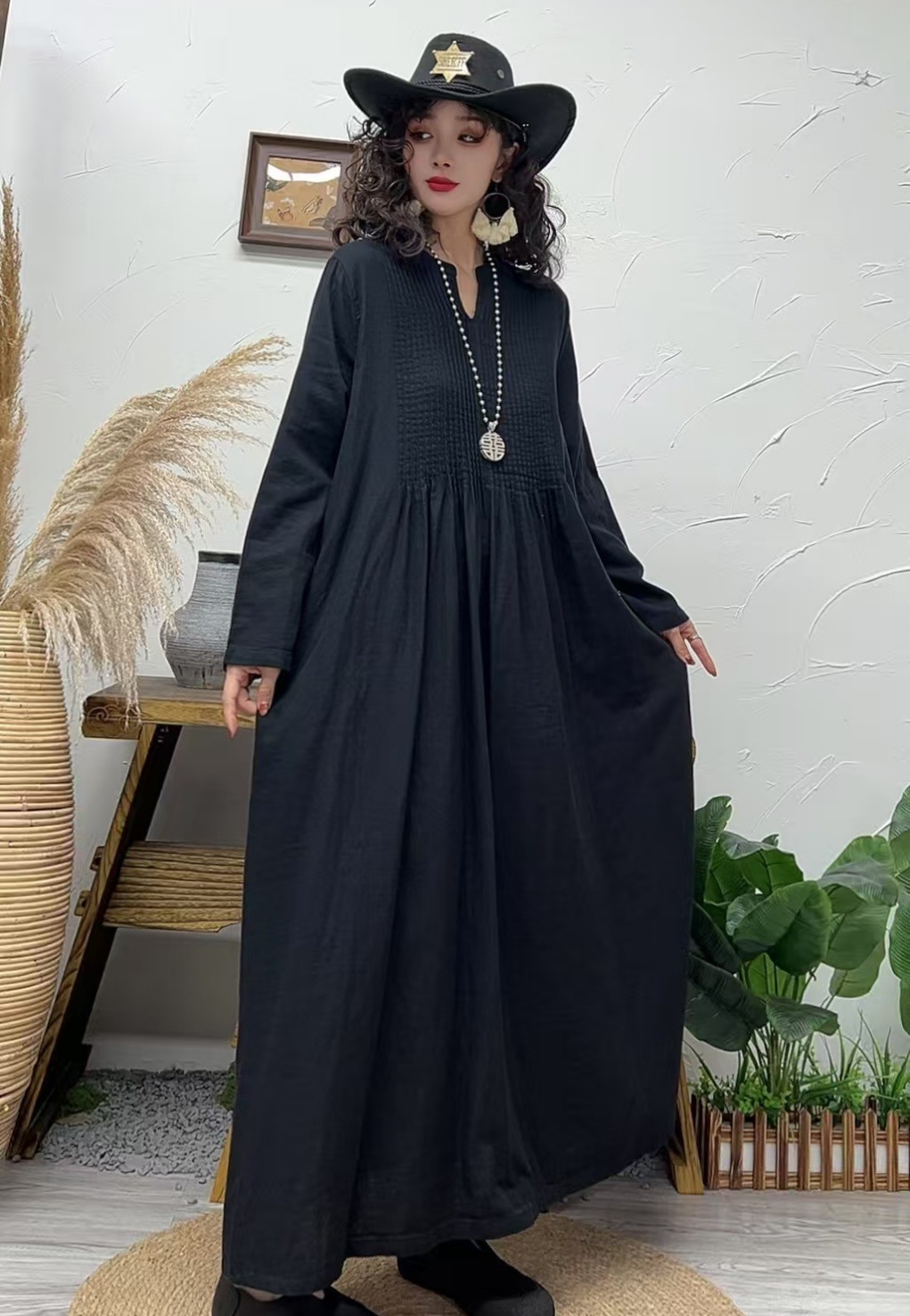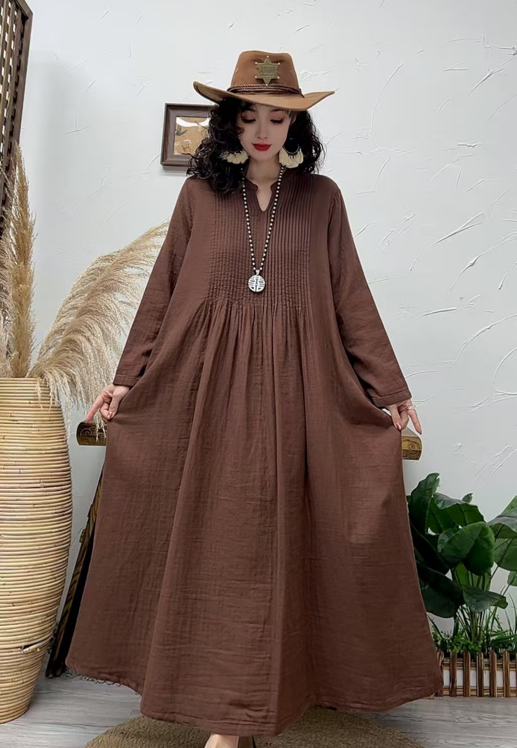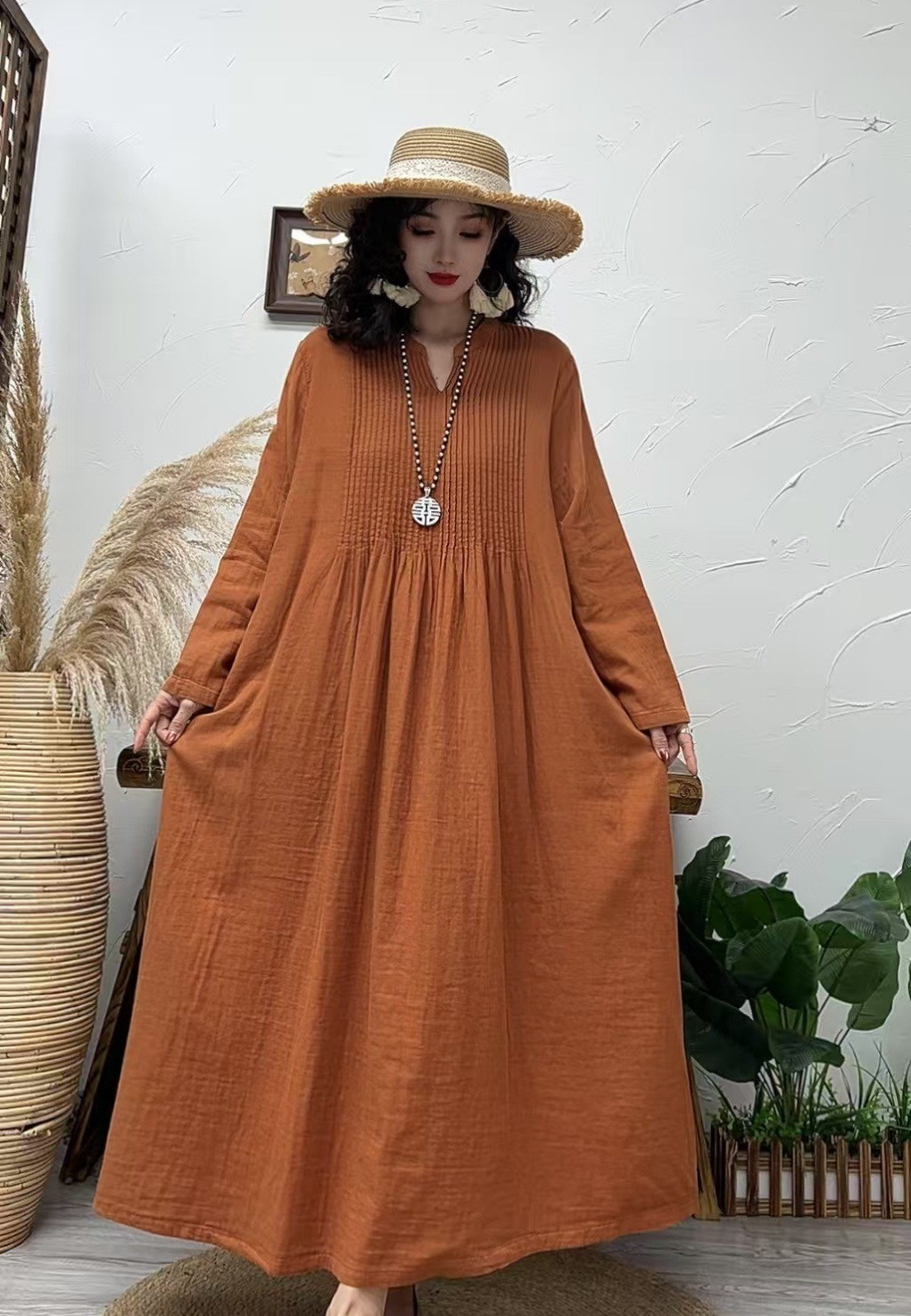 棉麻连衣裙文艺复古休闲风琴褶设计款长裙秋季新款长袖过膝大摆裙