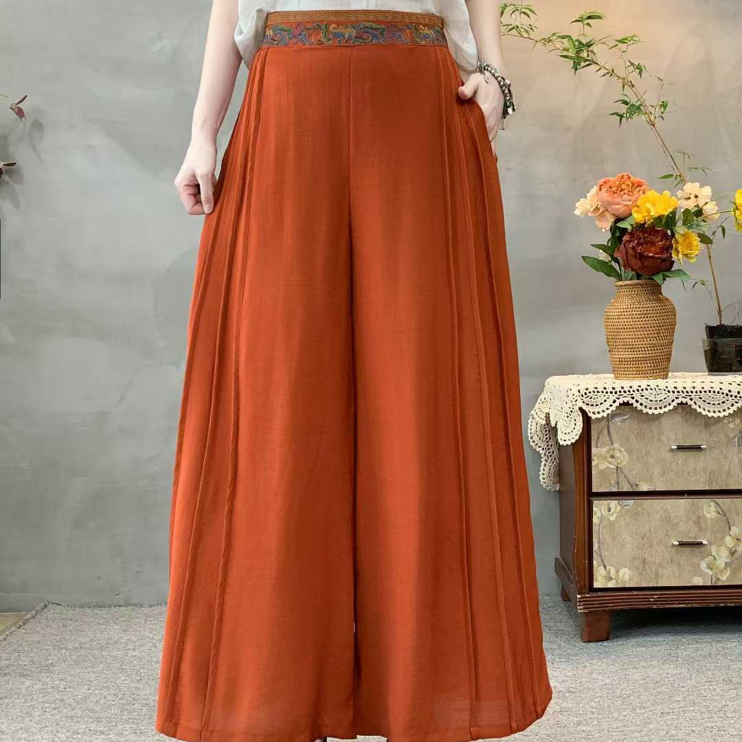 2025年夏 無地 ランニング用 シルク麻素材 ウエスト刺繍入り ストレートパンツ 薄手 レディース ゆったり 国風 九分丈パンツ