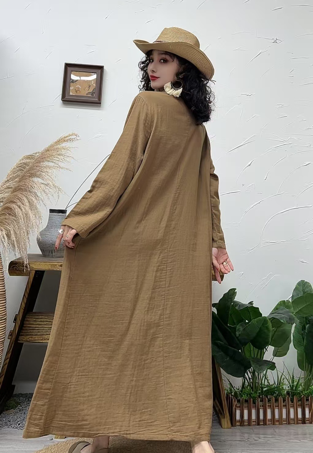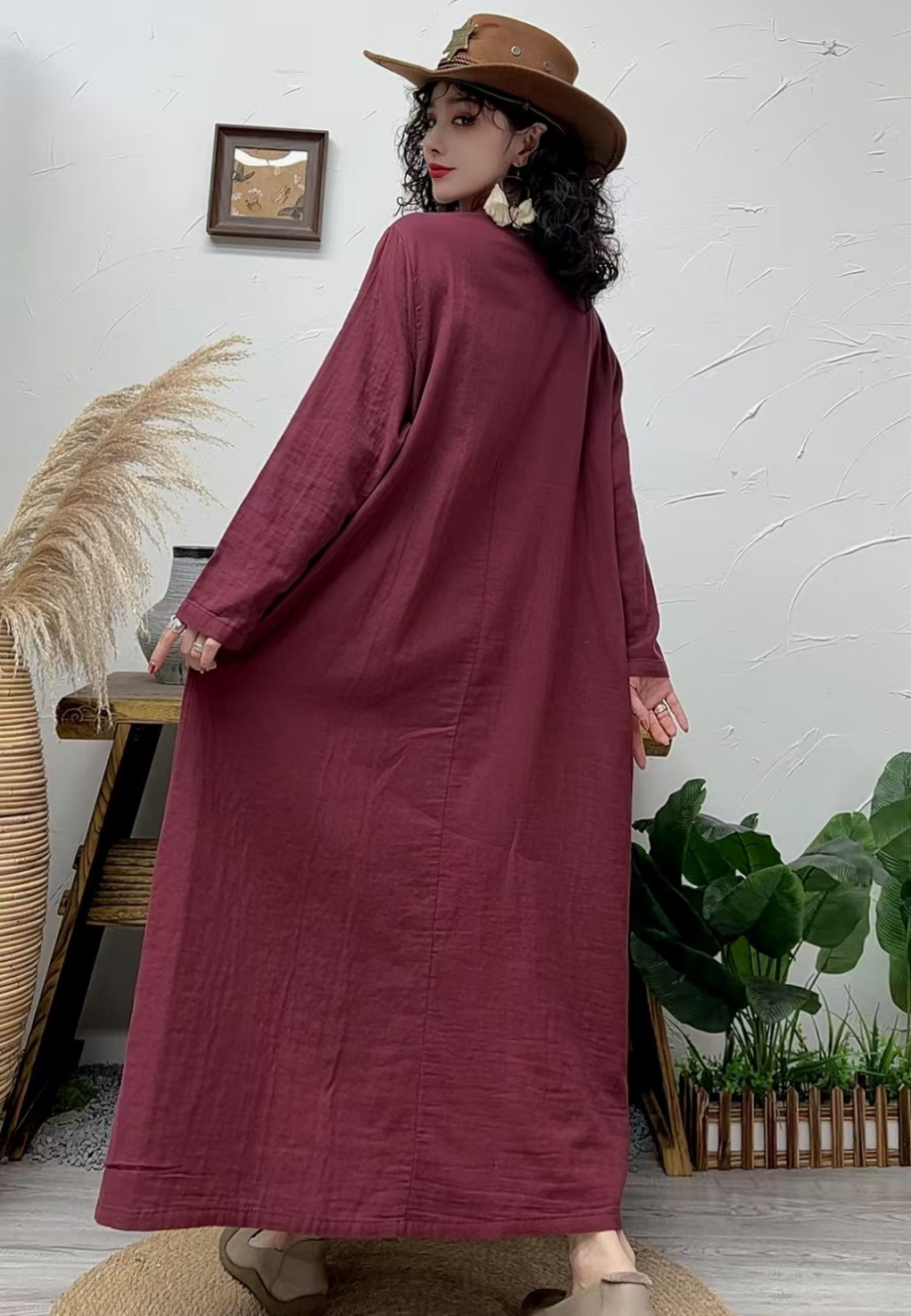 2025年と秋の新型婦人服綿麻vネック紫開前立て両は長袖で痩せて見えるワンピースを着ています。