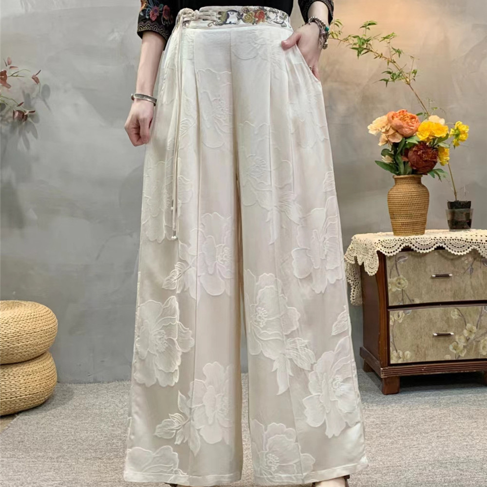 2025種類の夏のサテンの牡丹のジャカードの顔の国風のまっすぐな筒のズボンの腰の刺繍のフリンジの女性の9分のズボン