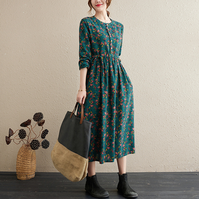棉麻连衣裙印花圆领套头复古文艺长裙秋季新款宽松长袖遮肉显瘦裙