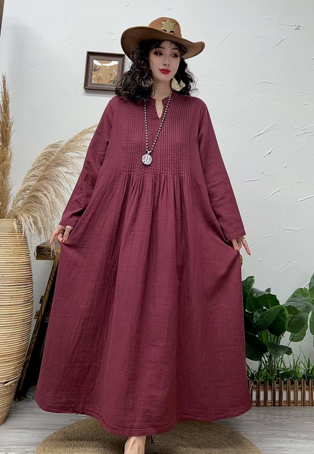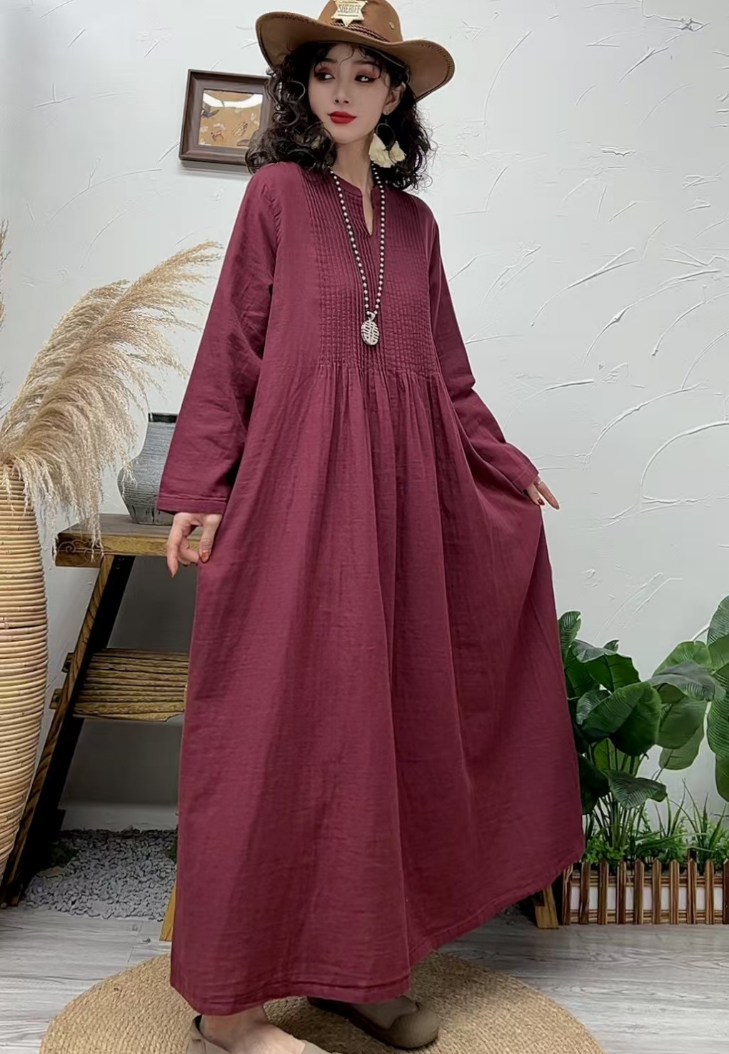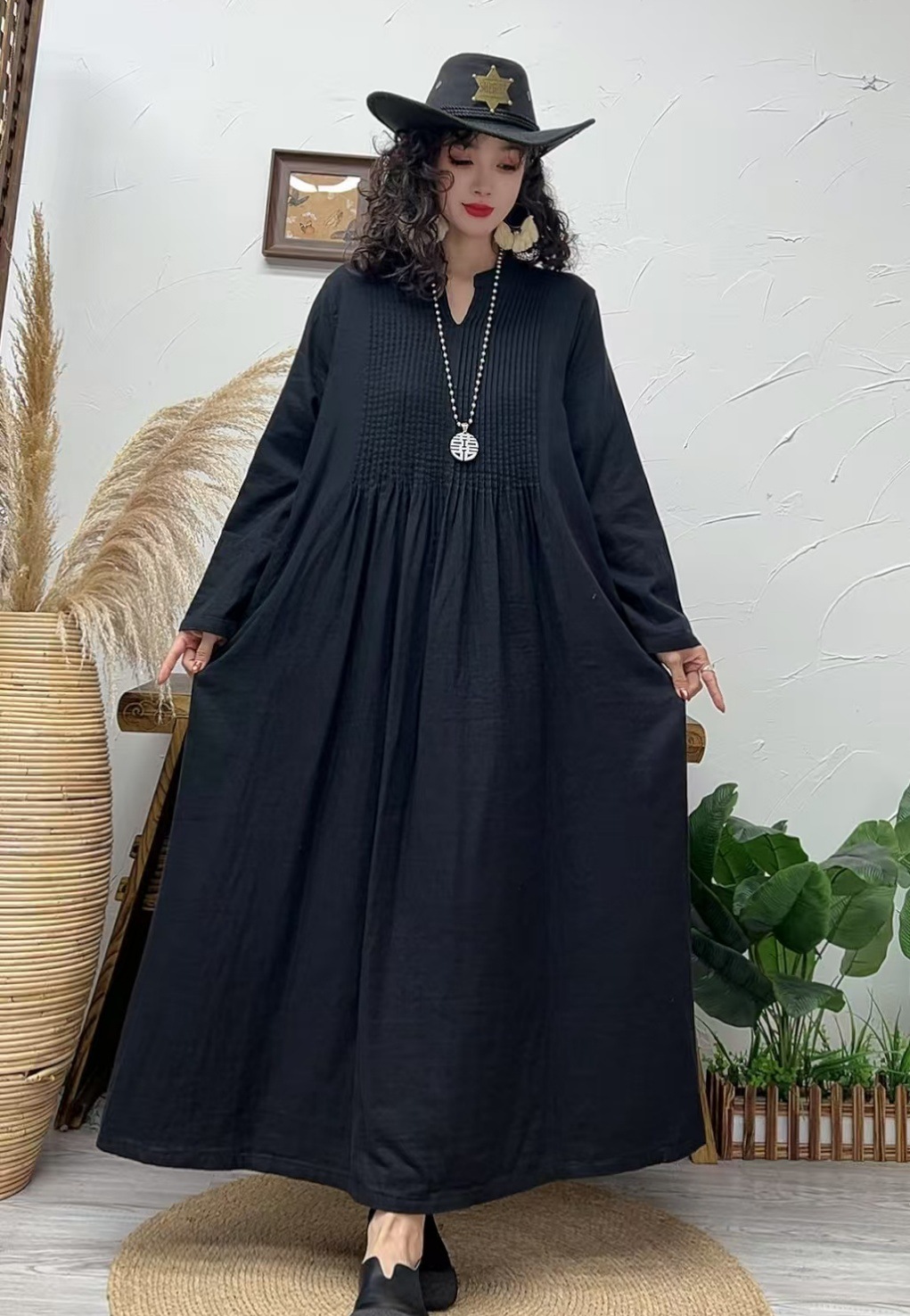 2025秋季棉纱净色加长款长裙长袖大摆款压碎褶文艺女士连衣裙
