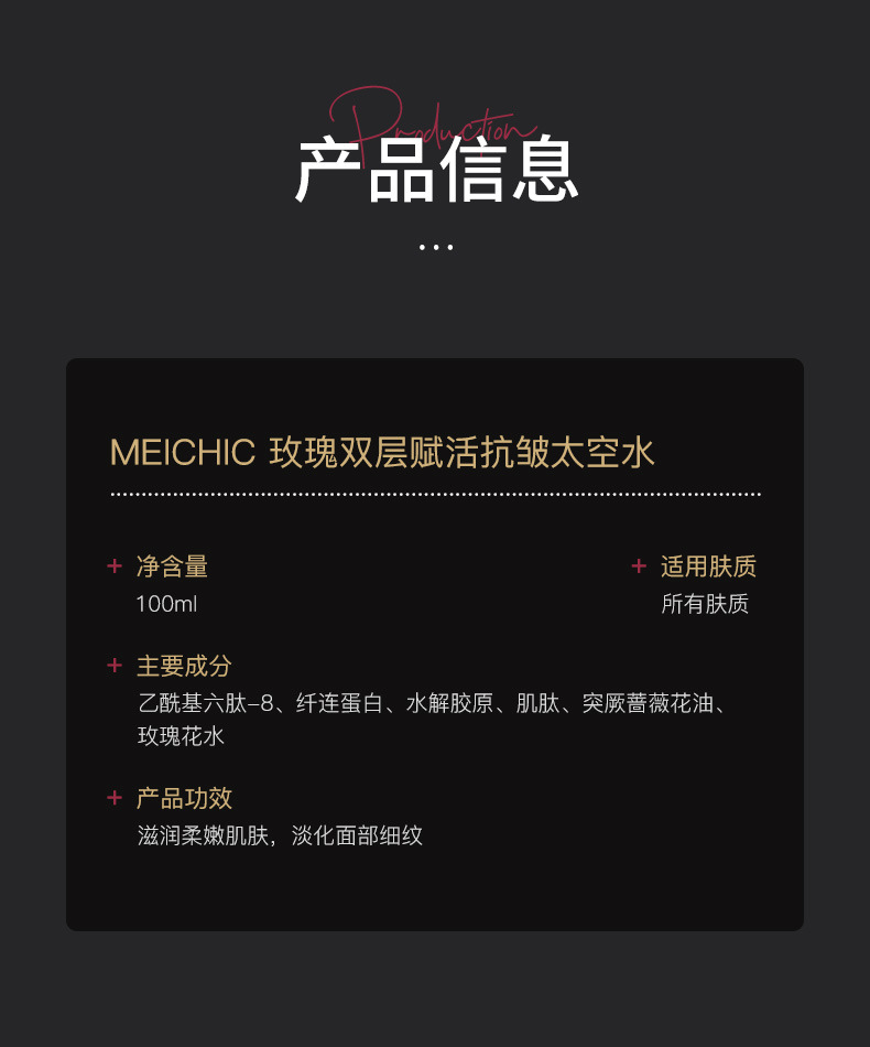 产品名称 MEICHIC玫瑰双层赋活抗皱太空水100ml