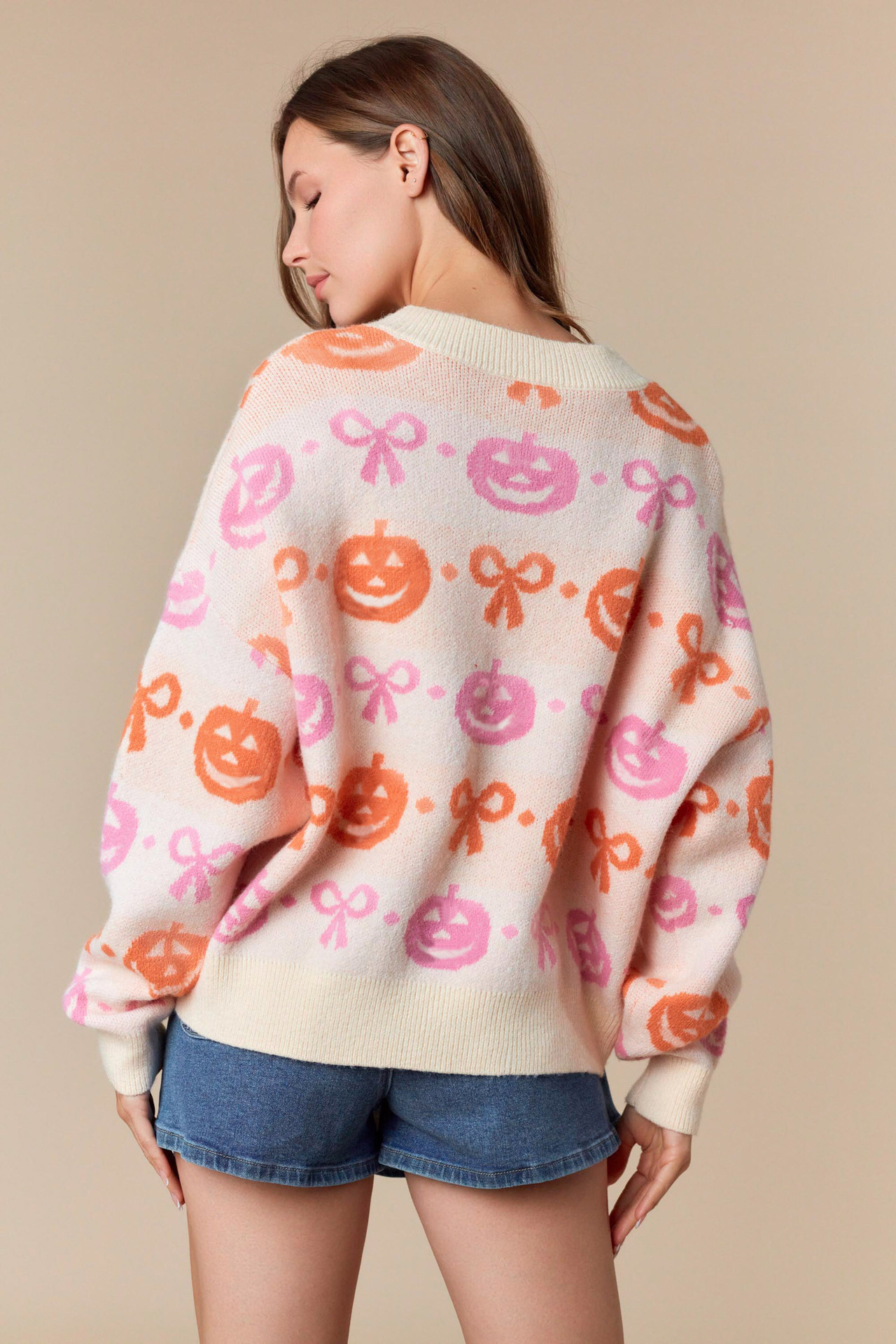 欧美跨境2025新款万圣节V领宽松南瓜提花开衫针织毛衣外套亚马逊