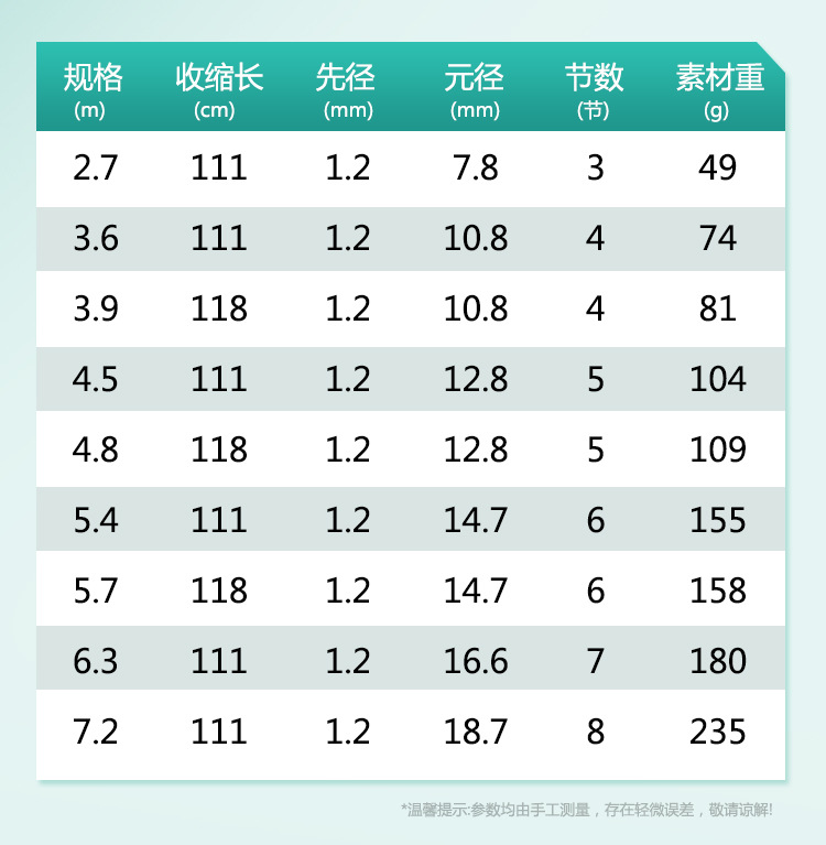 长度 2.7,3.6,3.9,4.5,4.8,5.4,5.7,6.3,7.2