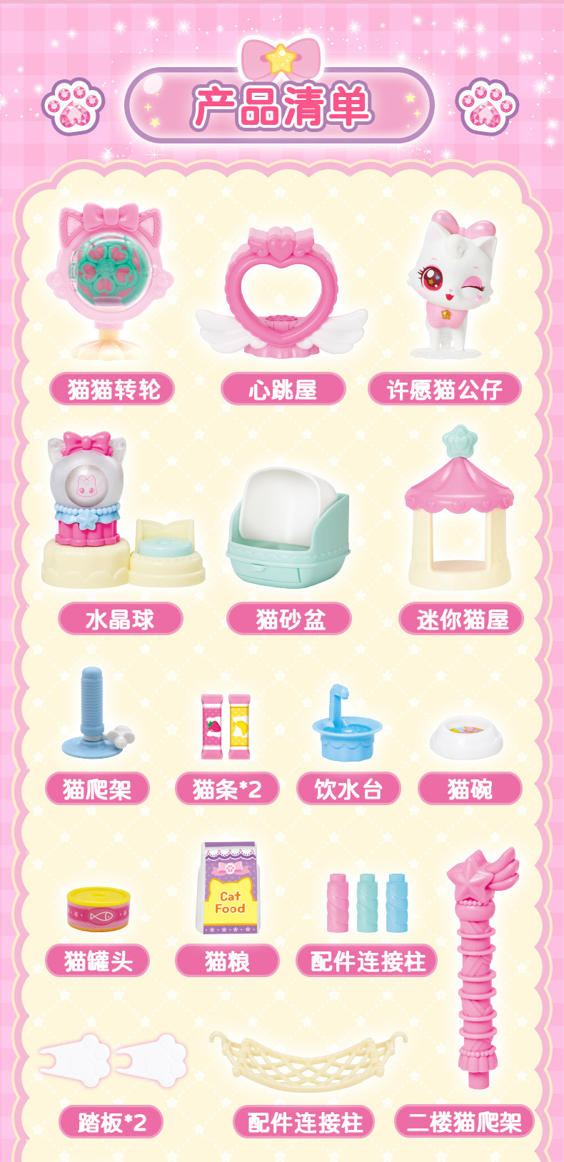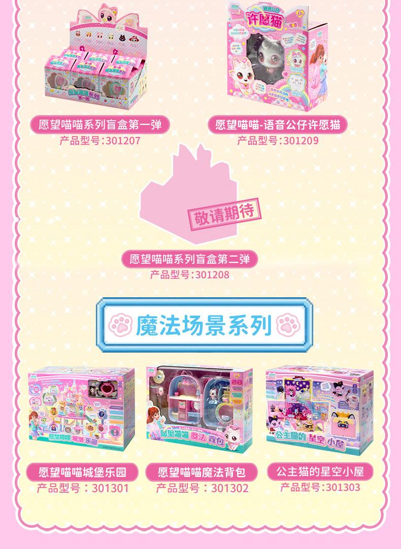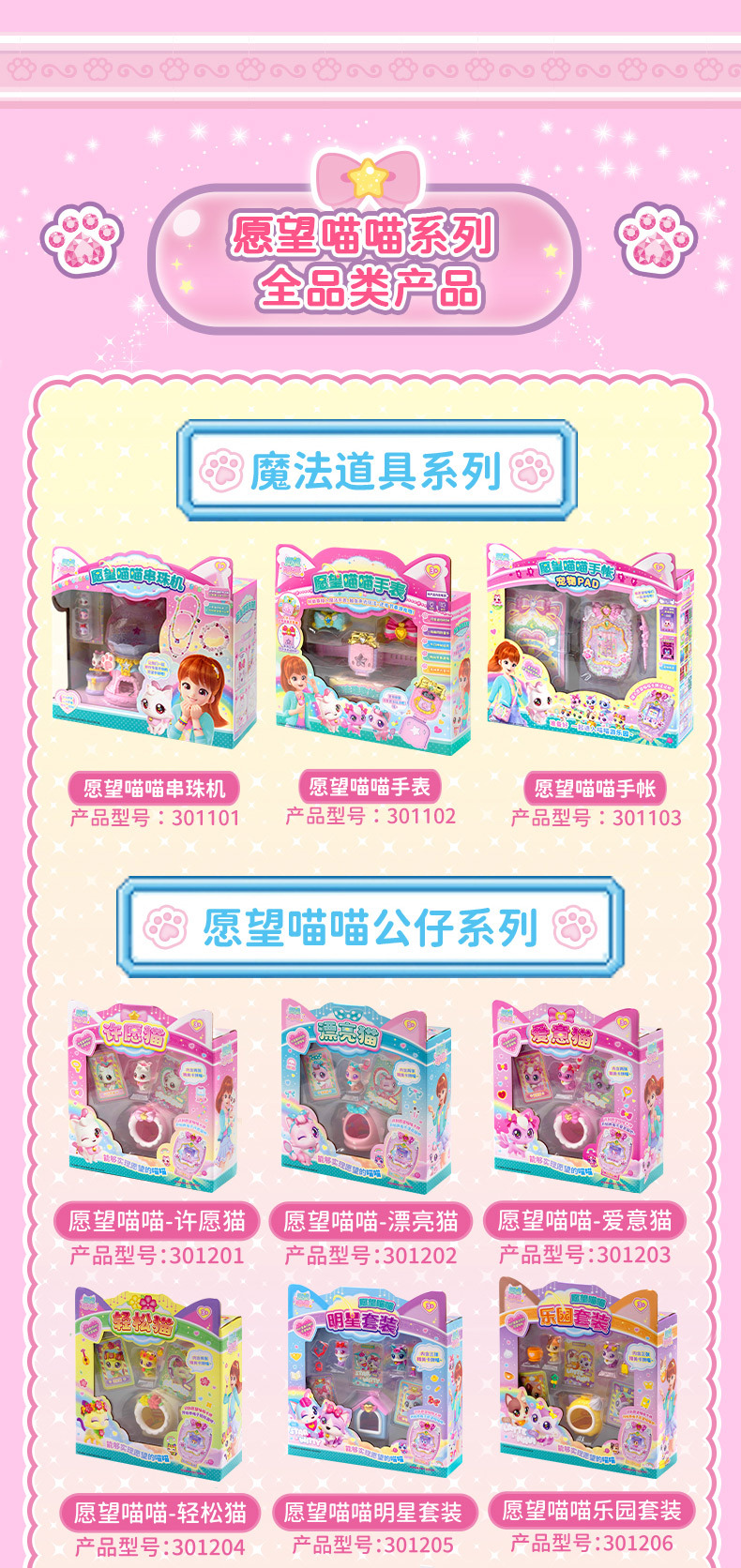 301301【城堡乐园】发声发光 按键变形 自动旋转 升降城墙 配件丰富 可联动单只公仔猫屋,301302【魔法背包】许愿猫+氛围灯+背包场景2种形态+送文具套装+配件丰富(联动其他喵喵),301303【公主猫的星空小屋】按键开灯/两种形态/赠特殊公主猫+多款饰品,301101喵喵召唤器【DIY串珠机】自动串珠+8吊坠+50克珠+固定器+串绳+收纳盒+说明书,301102多功能【喵喵手表】炫彩声光+听音乐+玩游戏+测运势+手表项链2种形态+送3徽章,301103多功能【喵喵手帐】彩色触控屏+养宠物+20种游戏+智能识别+功能卡牌+手帐套装,301201【许愿猫】公仔+猫屋+底座+手帐卡牌+角色卡牌(可合体其他猫屋),301202【漂亮猫】公仔+猫屋+底座+手帐卡牌+角色卡牌(可合体其他猫屋),301203【爱意猫】公仔+猫屋+底座+手帐卡牌+角色卡牌(可合体其他猫屋),301204【轻松猫】公仔+猫屋+底座+手帐卡牌+角色卡牌(可合体其他猫屋),301205【明星套装】聪明猫+可可猫+送手帐卡牌+猫屋(可合体其他猫屋),301206【乐园套装】拿铁猫+旅行猫+送手帐卡牌+猫屋(可合体其他猫屋),301207随机1款【喵喵公仔盲盒】独有公仔+猫屋+底座+手帐卡牌+连接器(可合体其他猫屋),301207整盒6款【喵喵公仔盲盒】独有公仔+猫屋+底座+手帐卡牌+连接器(可合体其他猫屋),301209【语音公仔许愿猫】智能互动+会说话/唱歌+运势模式+动画模式+关节可动