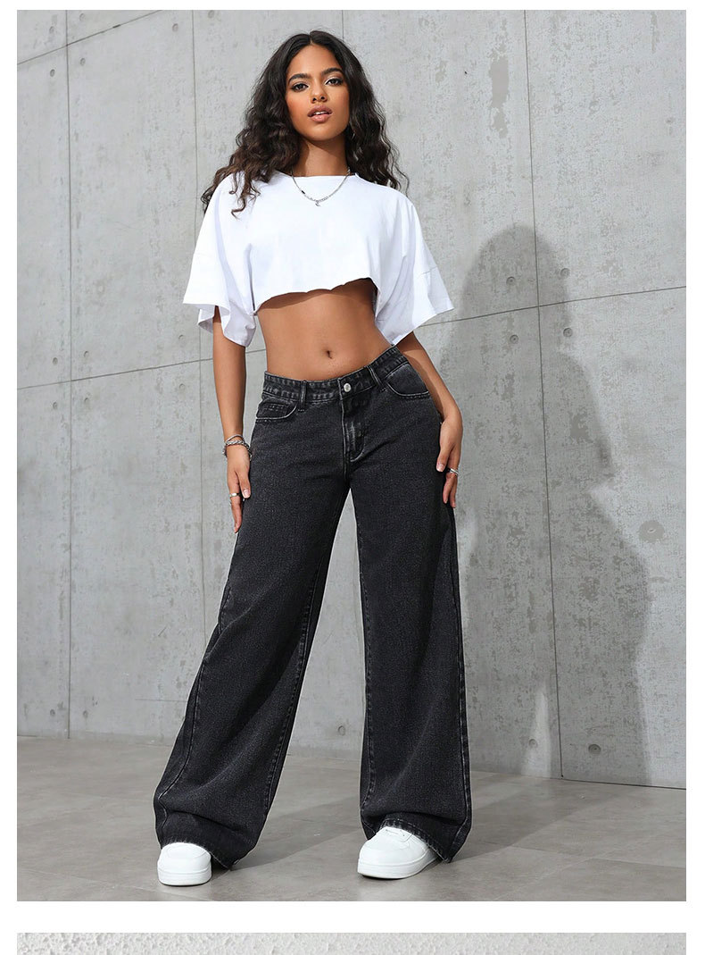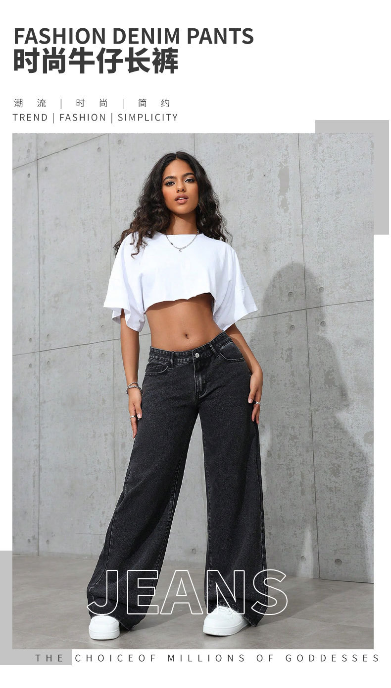 跨境欧美高腰宽松阔腿牛仔裤女显瘦百搭黑色直筒裤休闲时尚长裤子