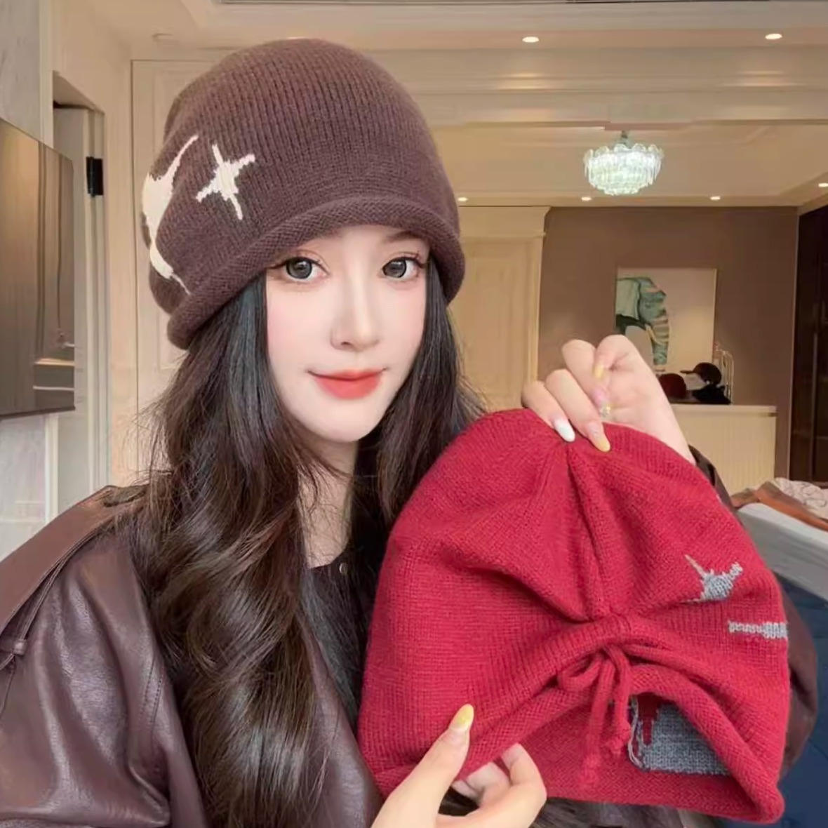 韩版百搭四芒星针织毛线帽子女秋冬显脸小卷檐包头冷帽休闲堆堆帽
