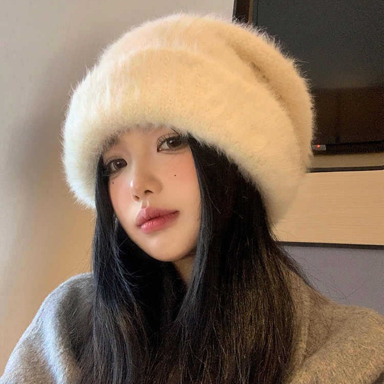 大头围加绒加厚兔毛毛线帽秋冬甜美百搭保暖帽显脸小护耳堆堆帽新