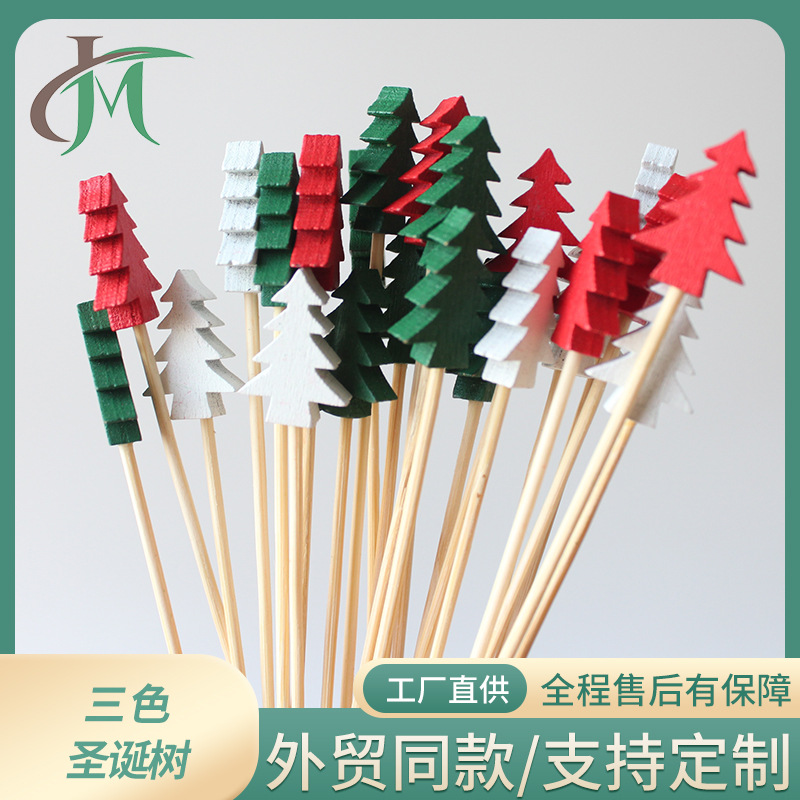 三色クリスマスツリー型フルーツピック100本/パック 緑色のモミの木型ビーズ串 使い捨てフルーツフォーク 竹串