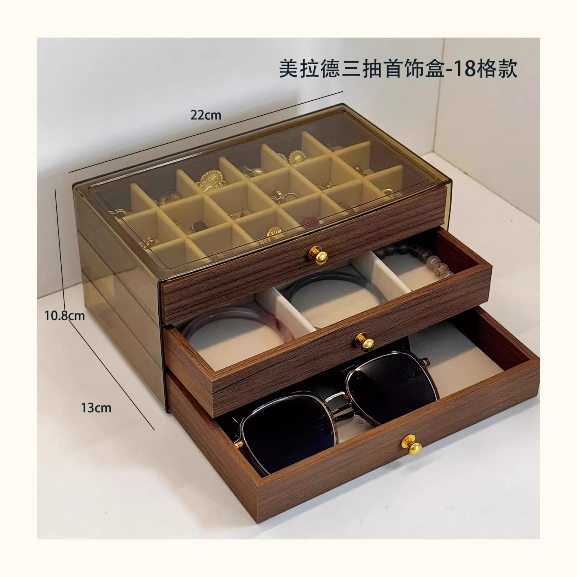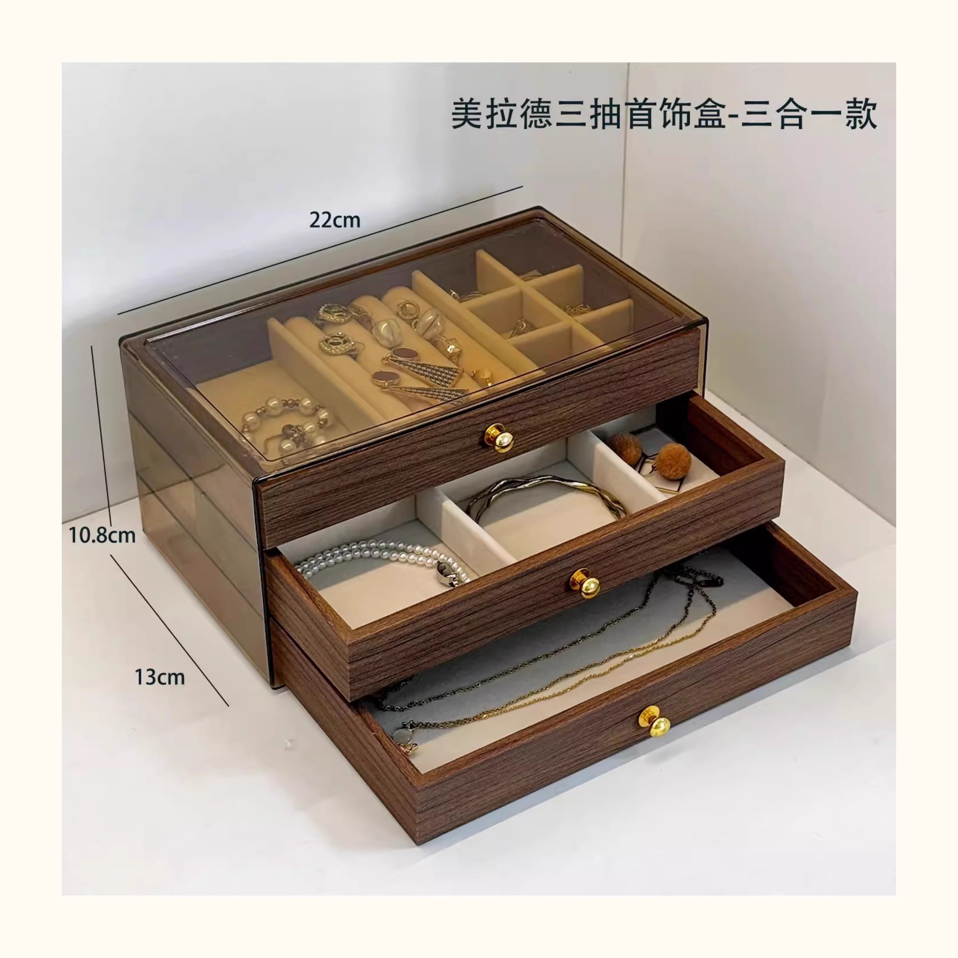 胡桃木色三合一首饰收纳盒多功能实木抽屉式饰品盒防尘防潮首饰盒