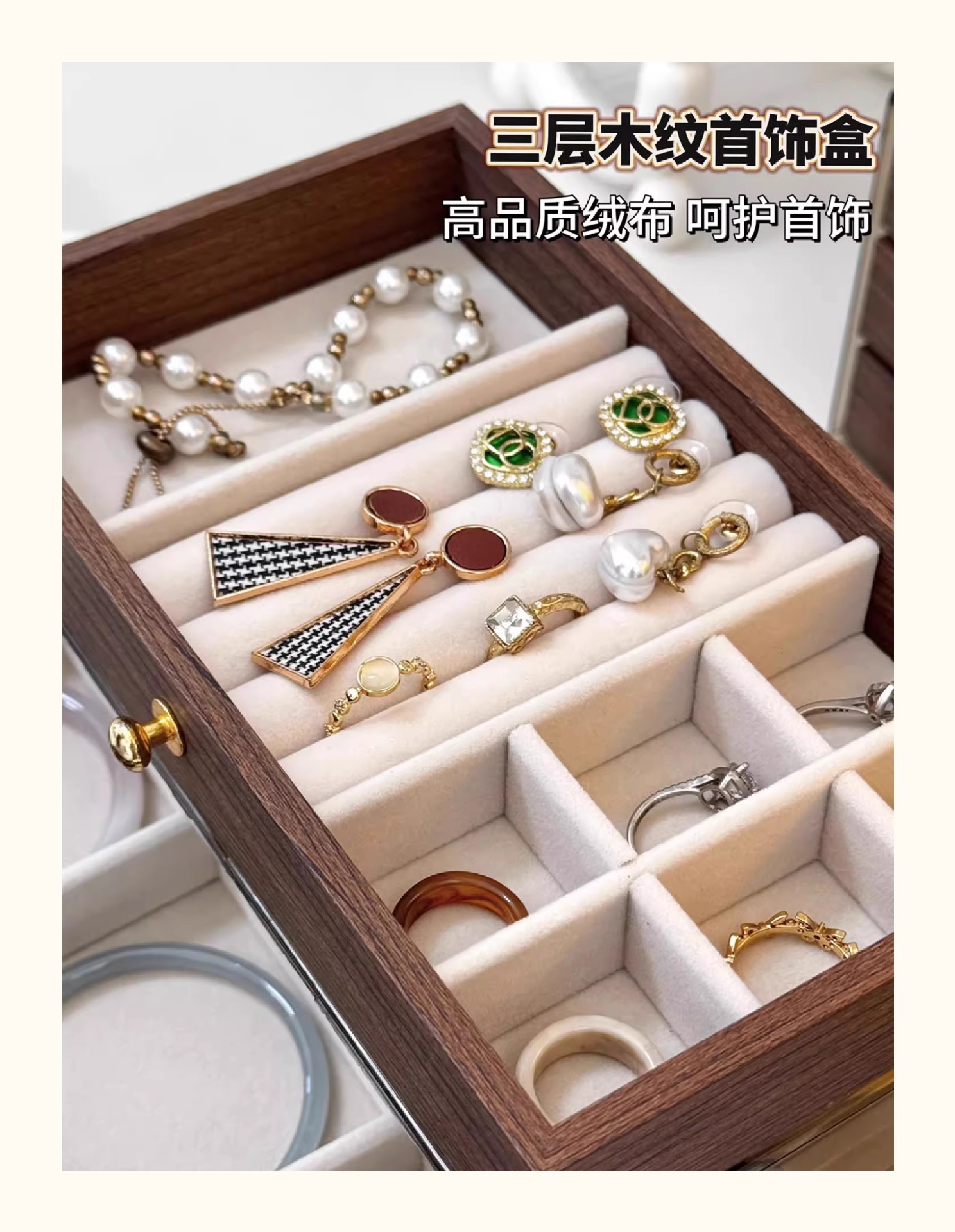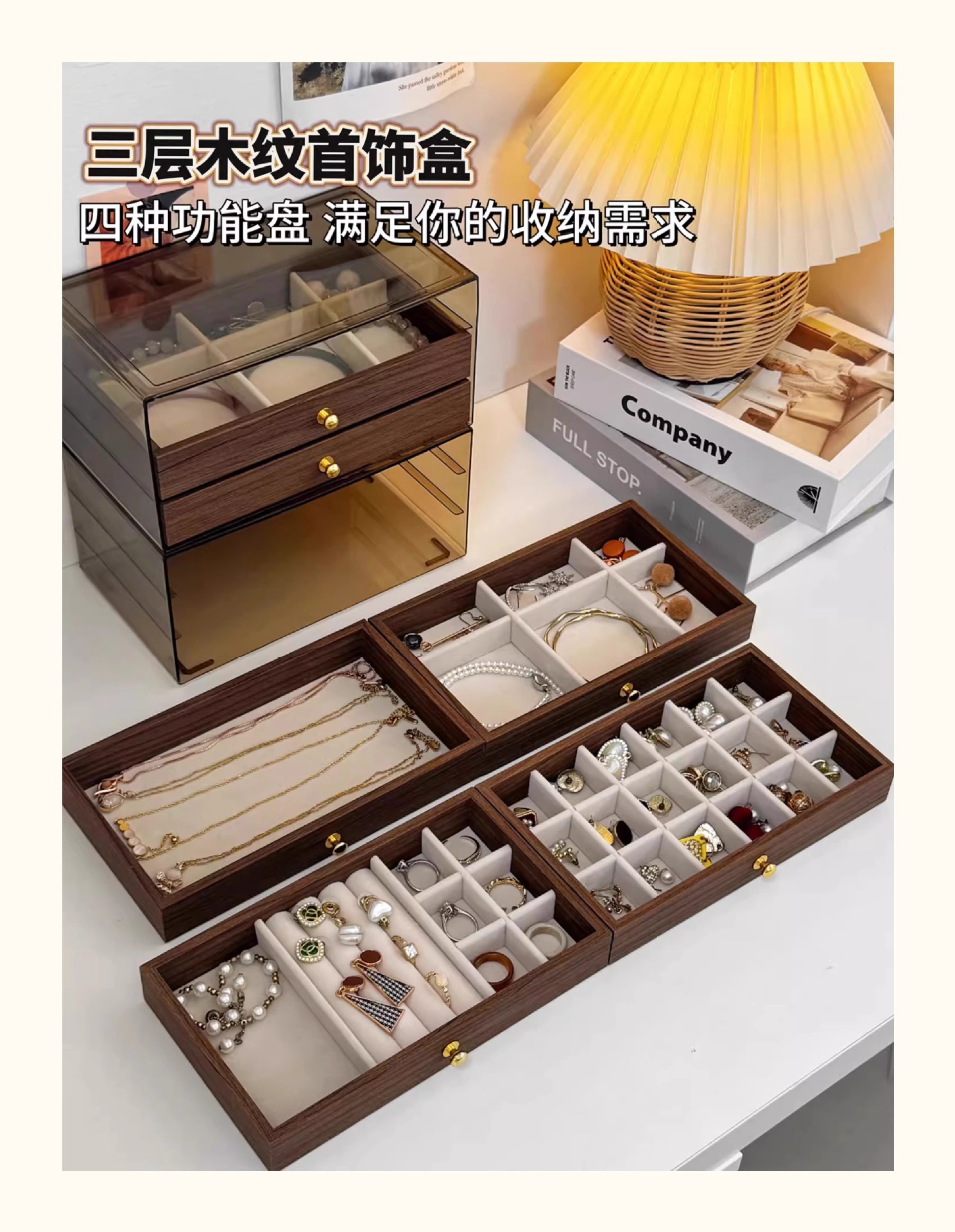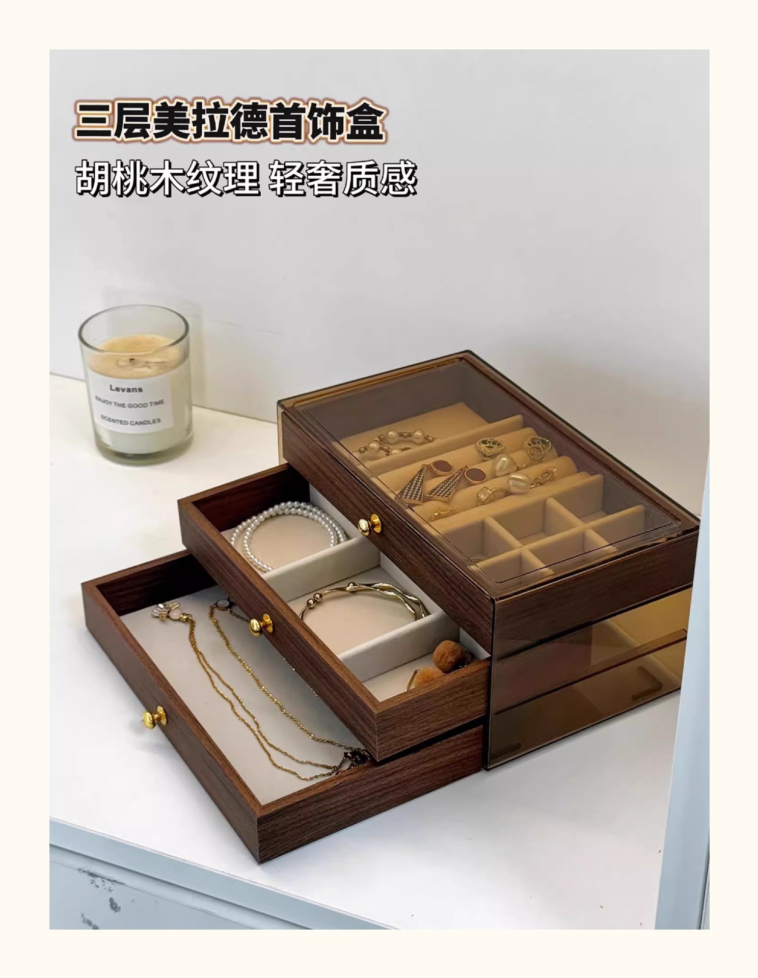 多層ジュエリーボックス、ハイエンドの絶妙なネックレスとイヤリング、クルミの木目調、大容量の2025年の新しいジュエリー収納ボックス
