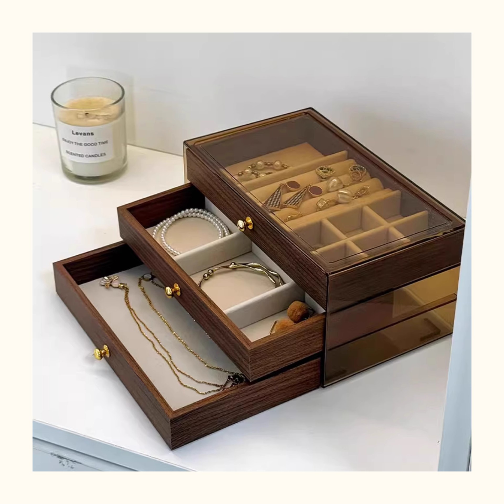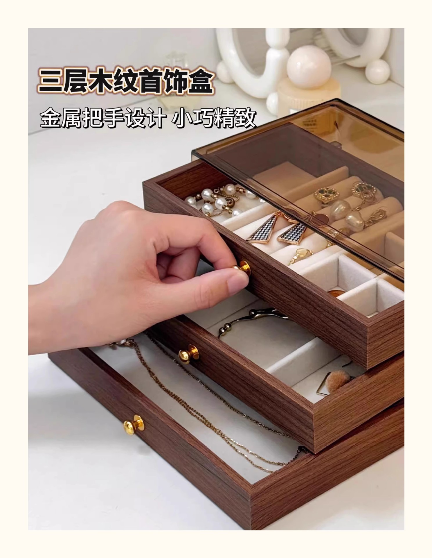 透明胡桃木首饰盒耳钉耳环项链饰品多层戒指收纳盒精致珠宝盒子