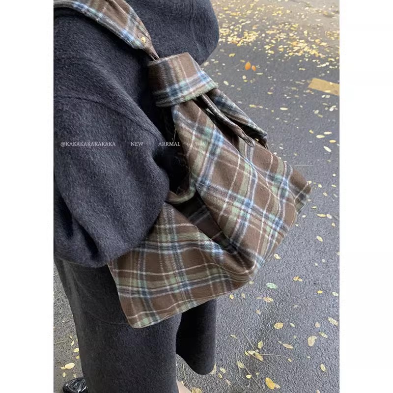 秋冬の毛の格子の大容量のカバンの女性の2024の新型のファッションの韓国の特のカバンの学院の風のシングル肩のわきの下のカバン