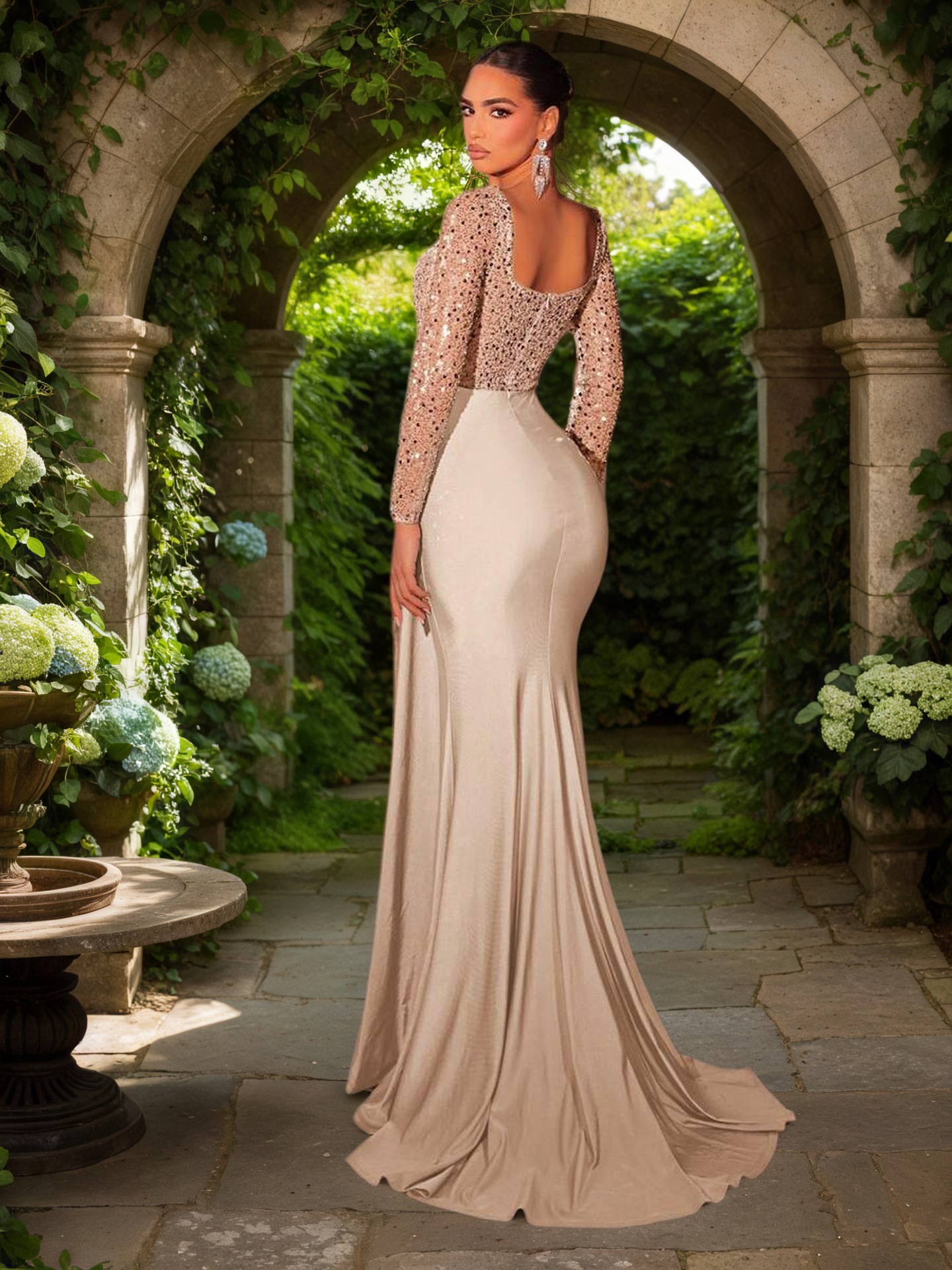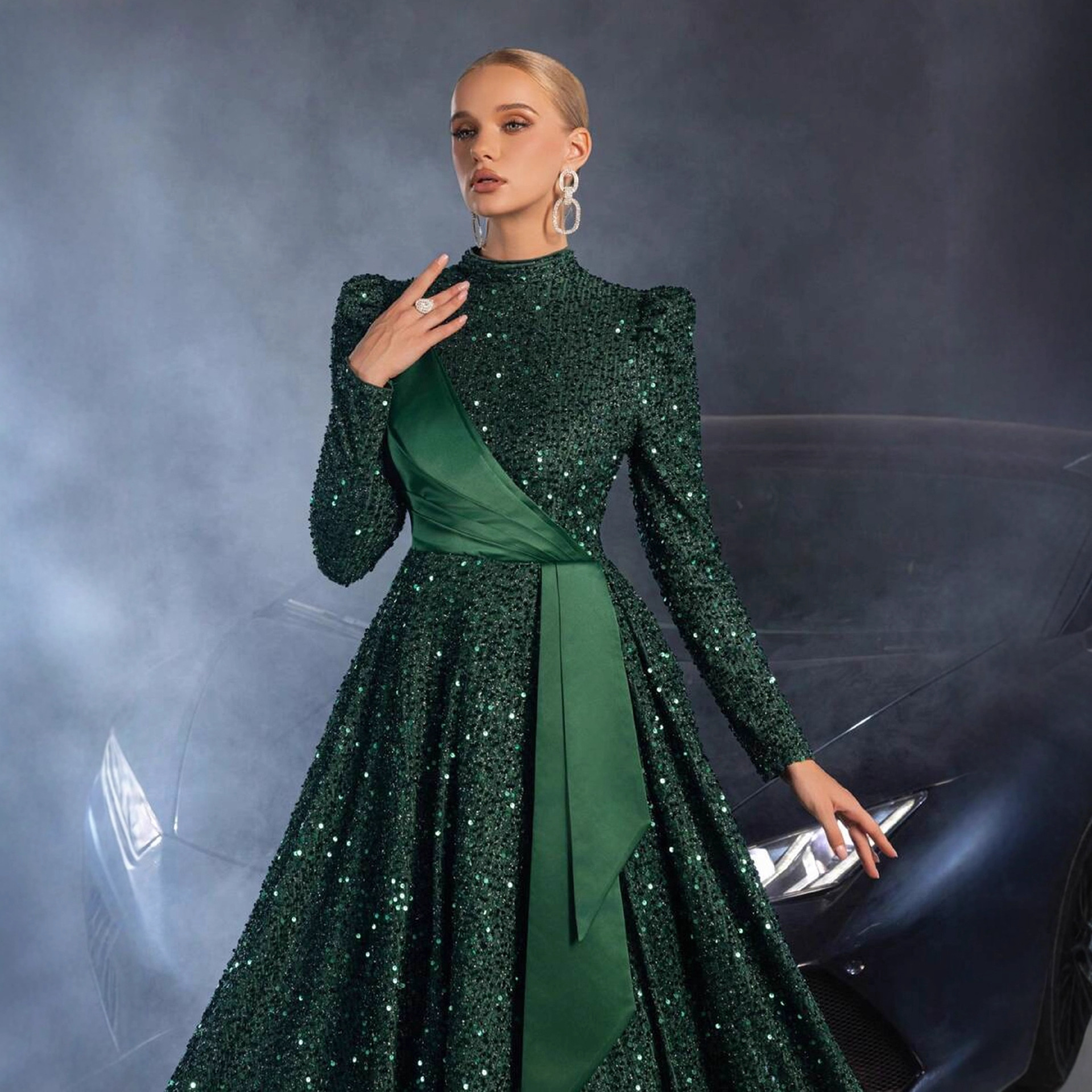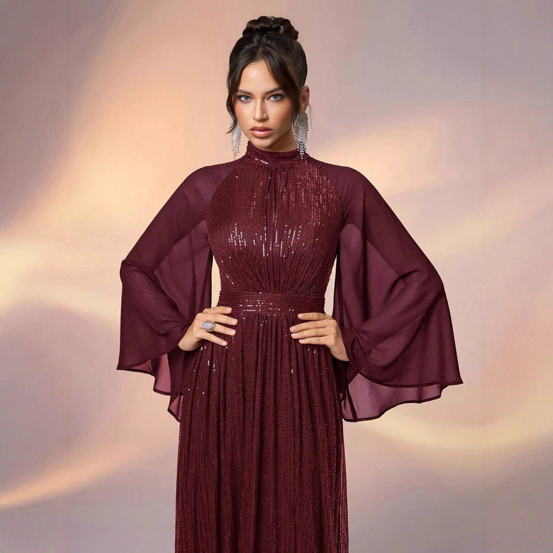 跨境外贸欧美优雅亮片插肩袖长款长袖晚礼服个性亮片连衣裙礼服