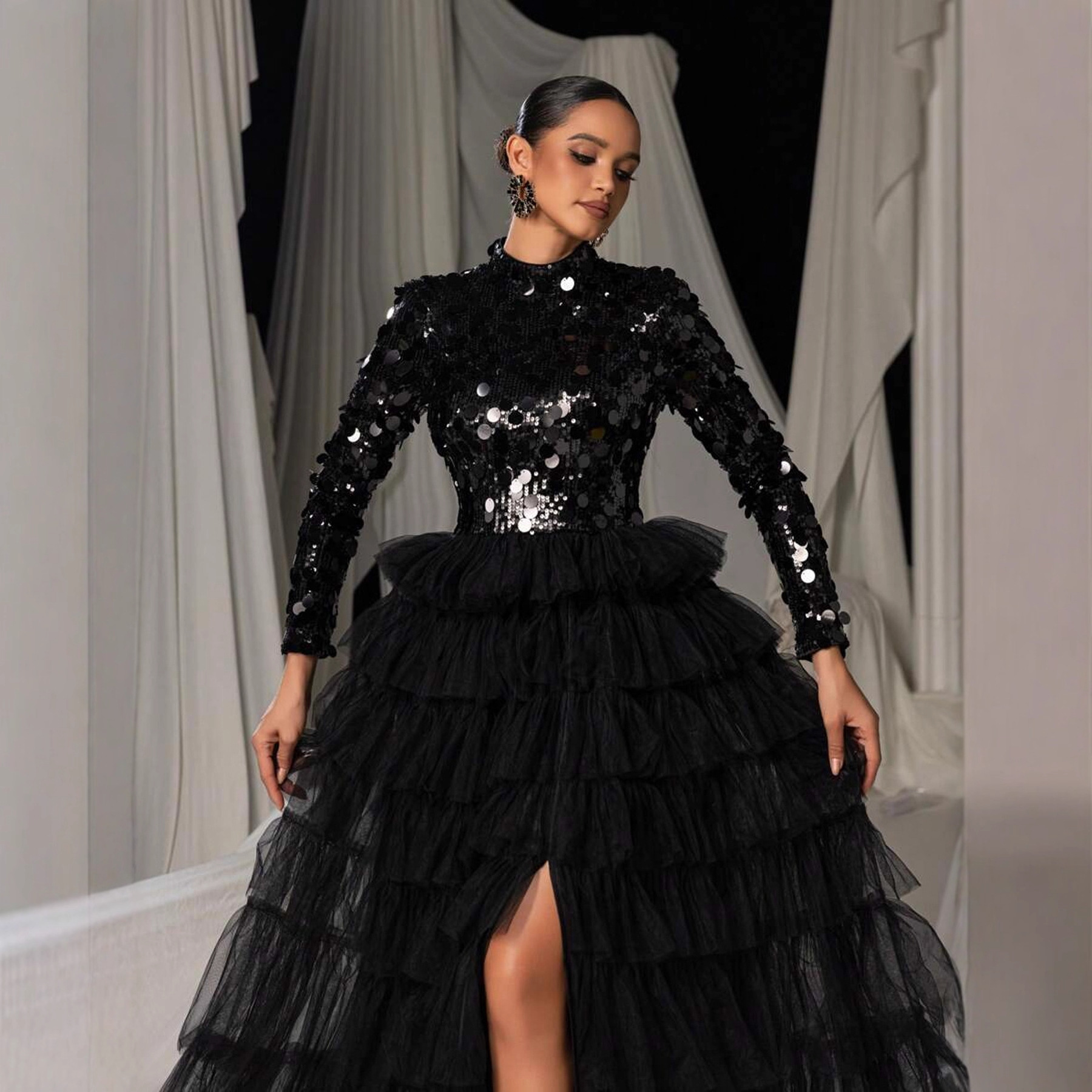 跨境欧美ins风礼服裙亮片大裙摆时尚宴会晚礼服网纱蛋糕裙仙女裙
