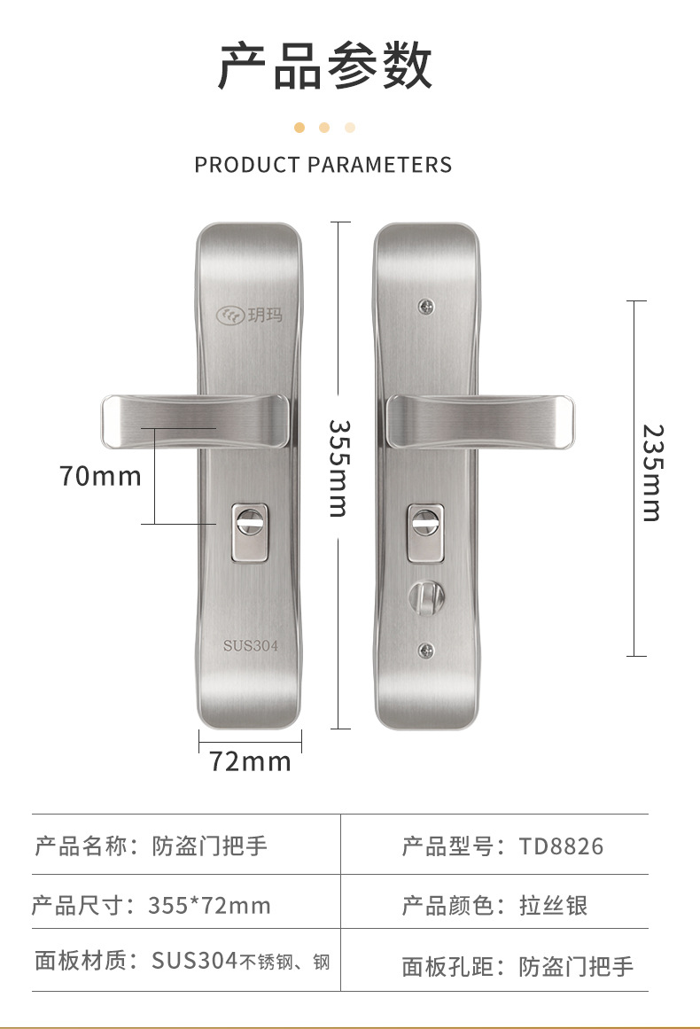 玥玛防盗门锁三件套不锈钢把手C级锁防撬门锁大门家用通用型把手