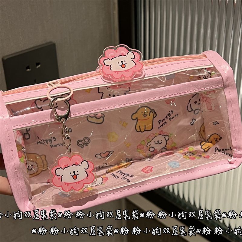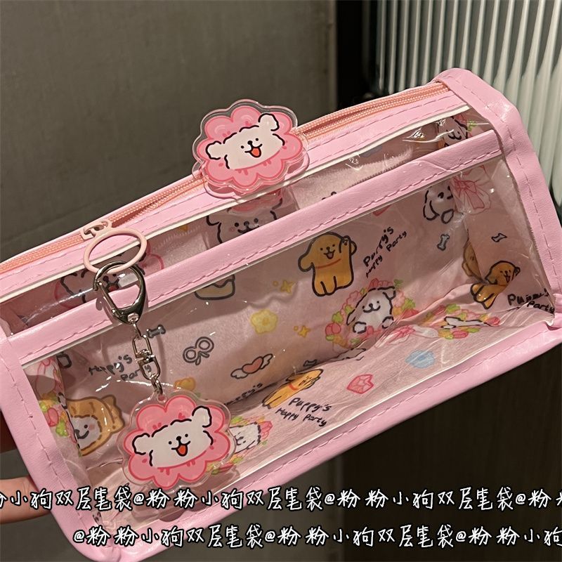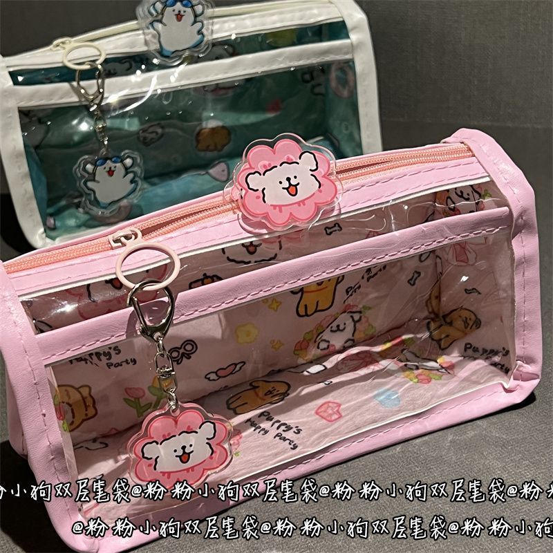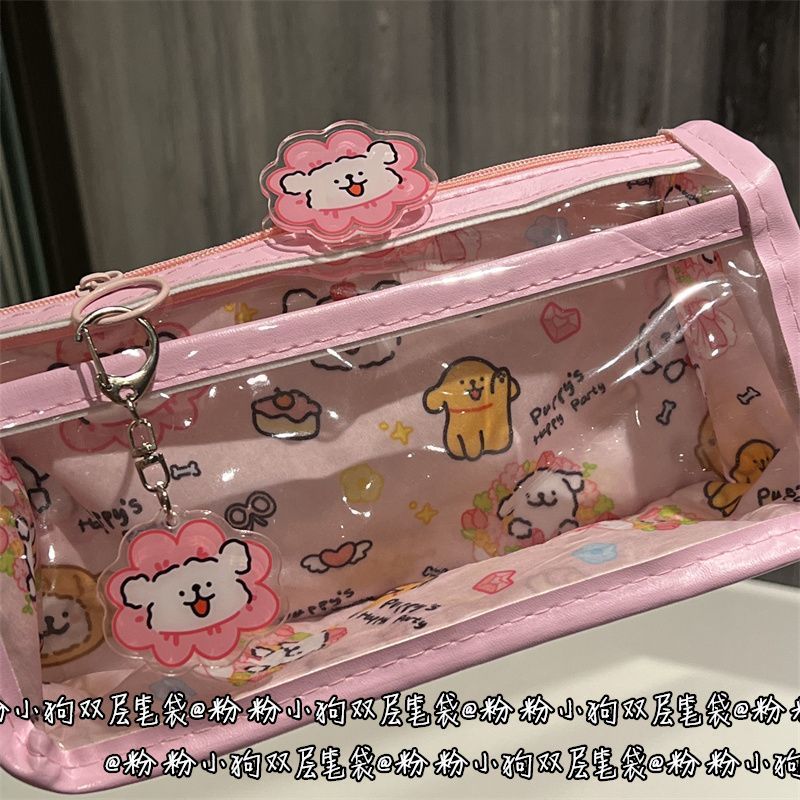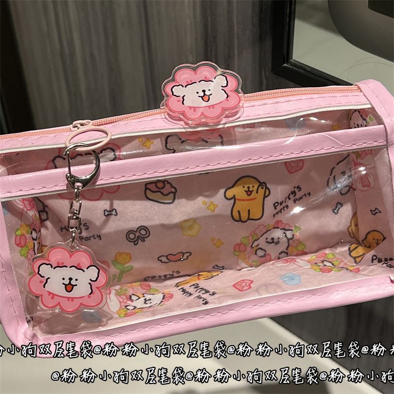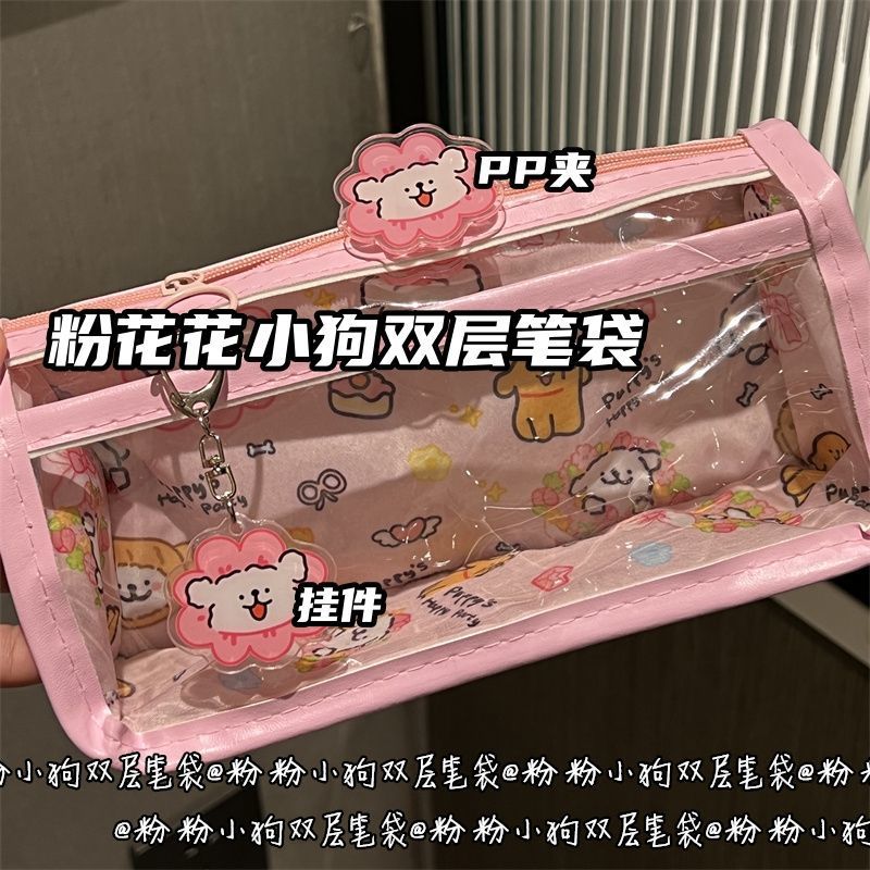 花花小狗狗双层笔袋透明ins风高颜值少女心学生大容量文具收纳袋
