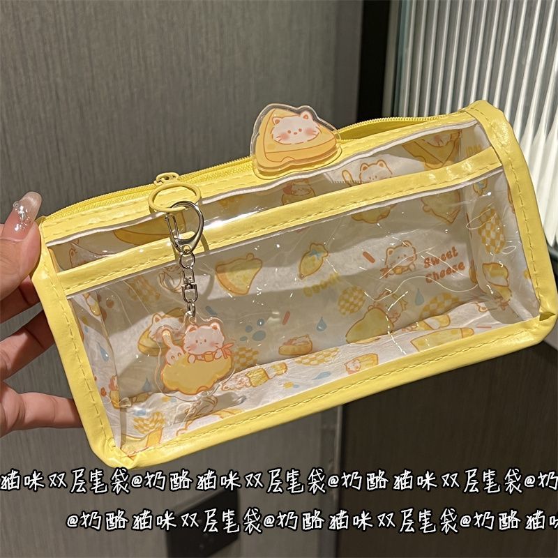 桔沐臻奶酪猫咪双层笔袋ins风高颜值少女心学生文具透明收纳袋