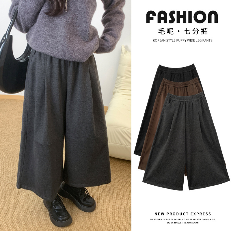 慵懒风毛呢七分阔腿裤女秋冬高腰显瘦直筒休闲裤宽松百搭弯刀裙裤