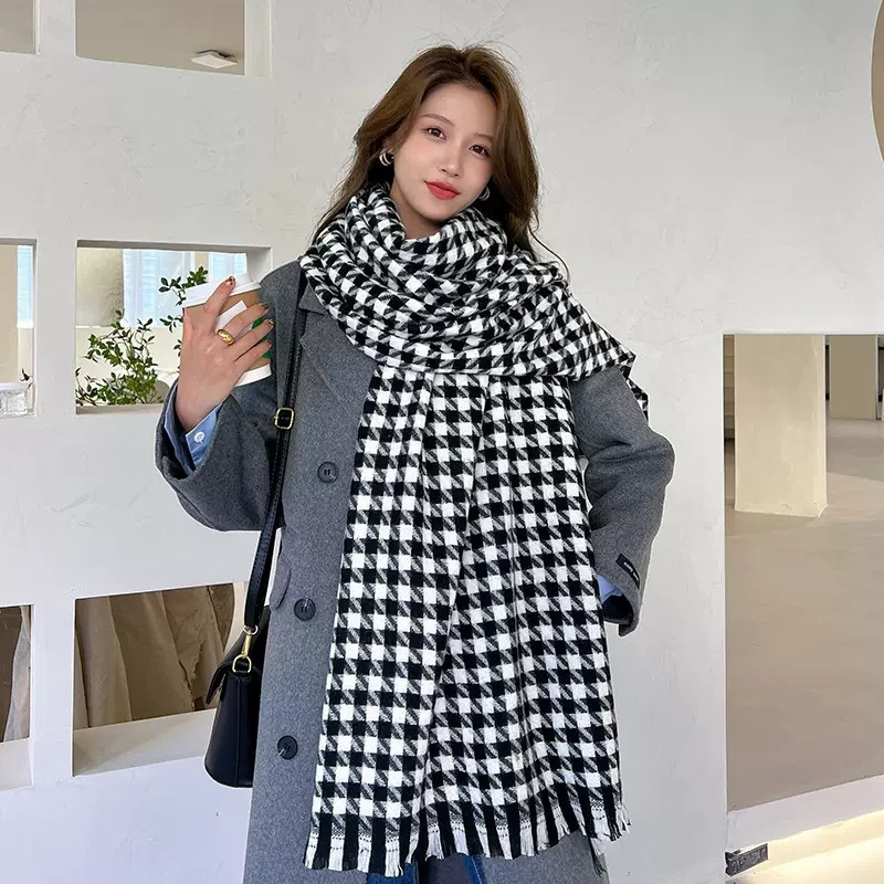 2025新款围巾女秋冬韩系氛围感纯色千鸟格美拉德围脖仿羊绒批发