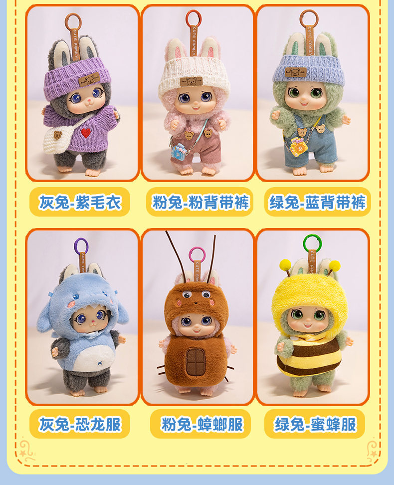 颜色 棕熊,灰象,小狗,灰兔,粉兔,绿兔,棕熊—毛衣,小狗—毛衣,灰兔—蓝毛衣,绿兔—粉毛衣,灰兔—紫毛衣,粉兔—蓝毛衣,灰象—背带裤,粉兔—粉背带裤,绿兔—蓝背带裤,灰兔—恐龙服,粉兔—蟑螂服,绿兔—蜜蜂服