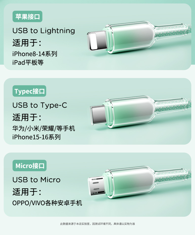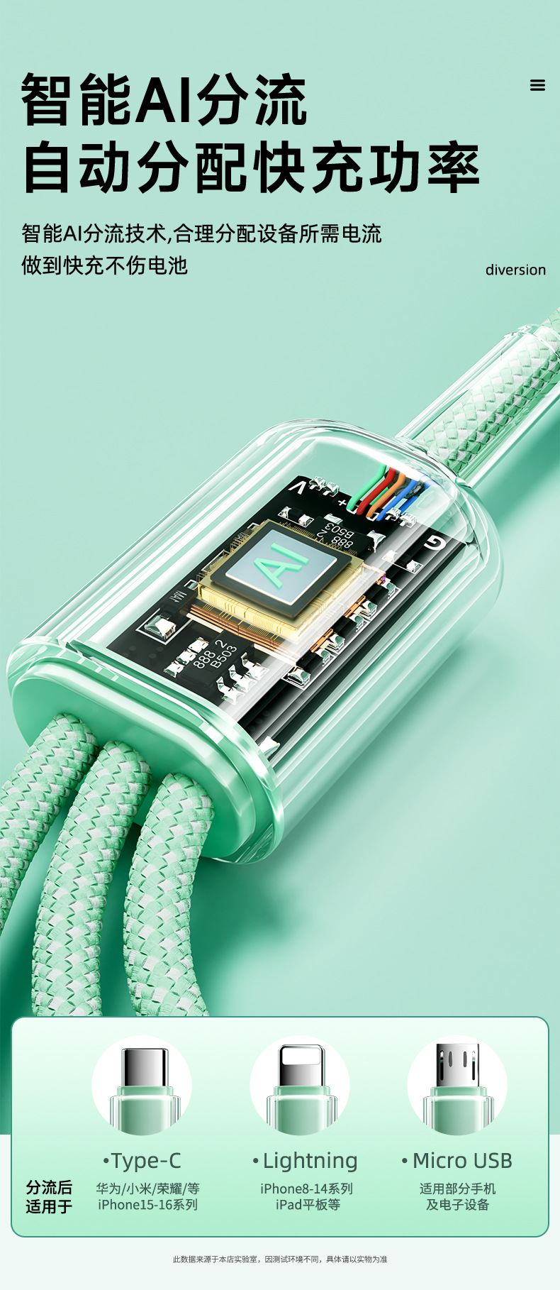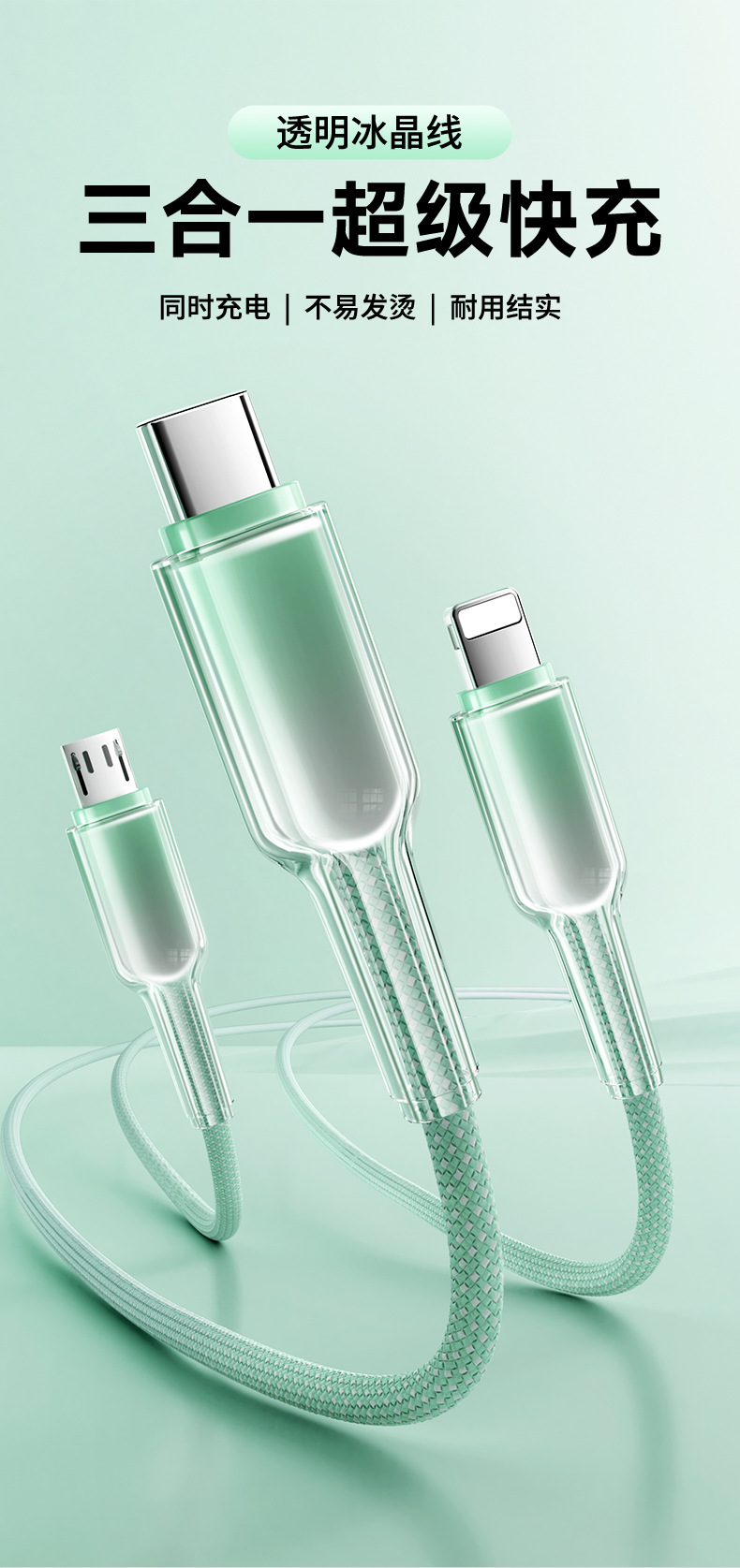 120W冰晶渐变一拖三超级快充数据线适用苹果华为Type-C手机充电线