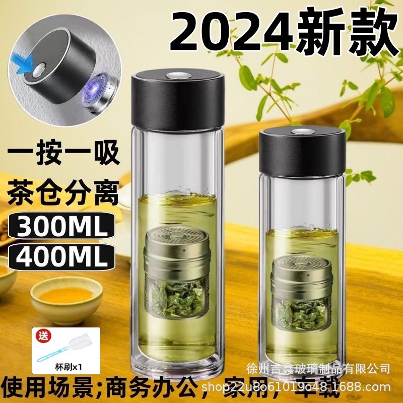 新しいワンクリックオープン蓋高ホウケイ酸ガラス二重層ガラス家庭用ウォーターカップ車の茶水分離クイックオープンカップ