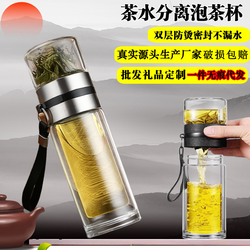 卸売茶水分離茶器カップ高硼珪酸ガラス水カップメンズ二重層茶器カップ刻印入りギフトカップ