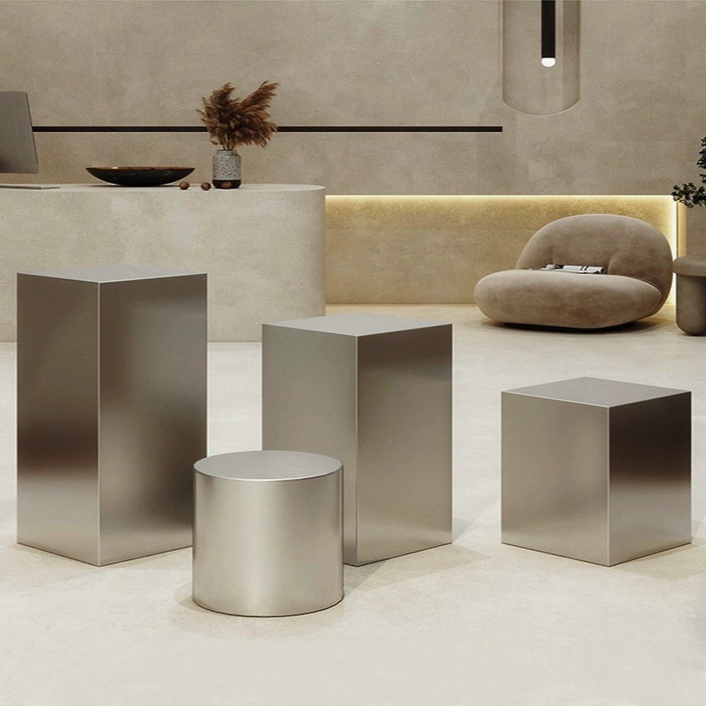 洋服店男性婦人服展示棚ステンレス展示台陳列棚の真ん中に買手店の物置台が置かれている