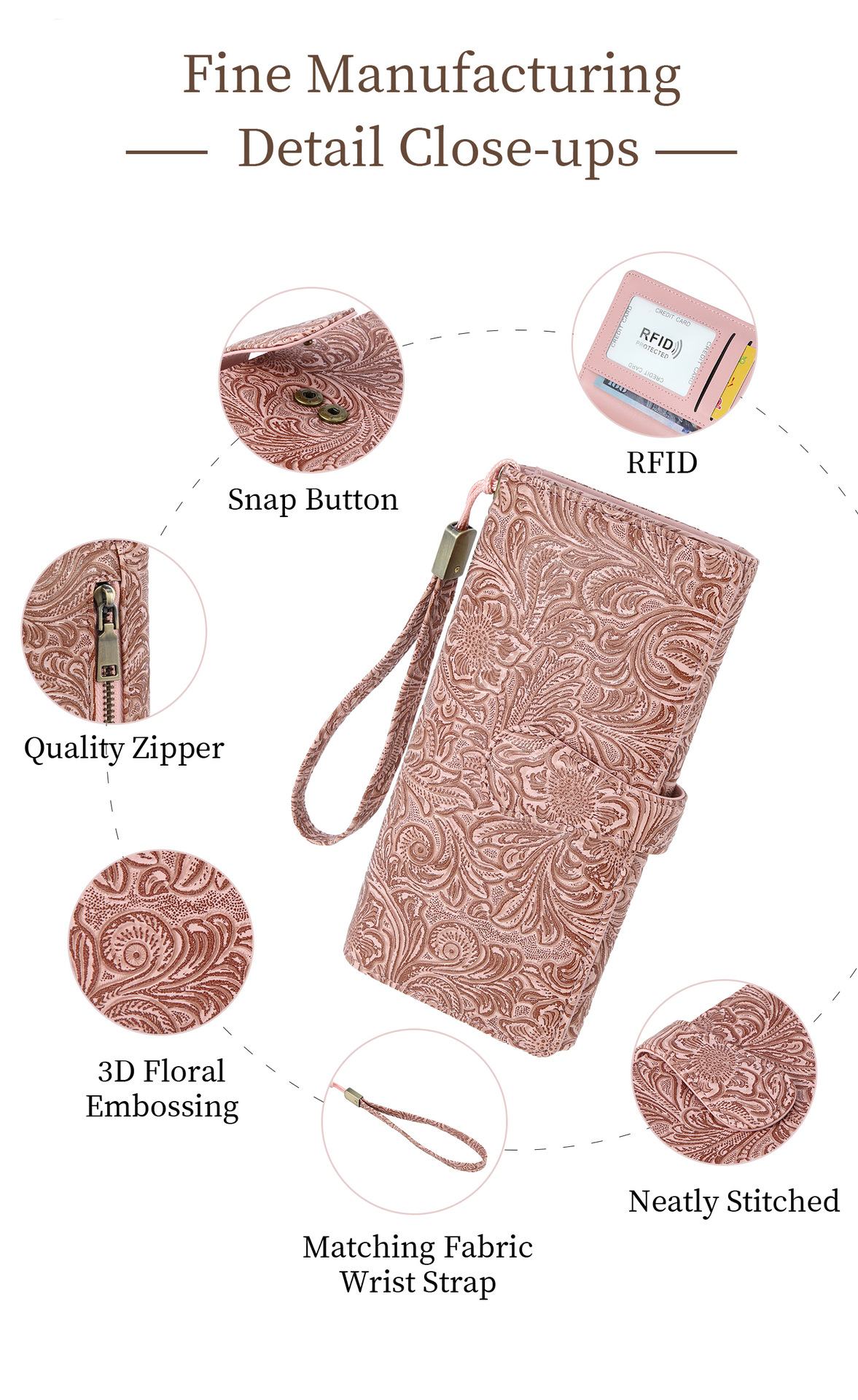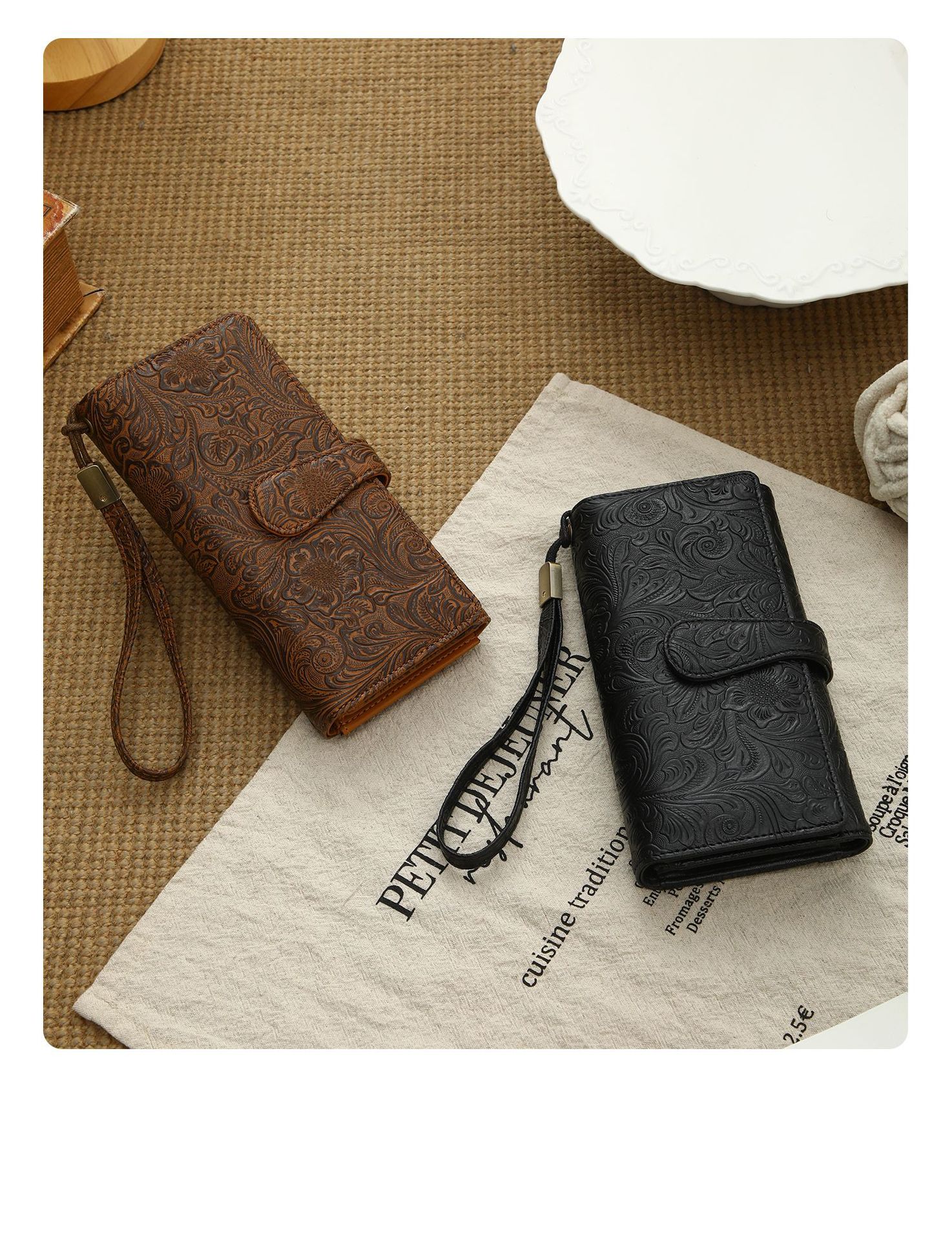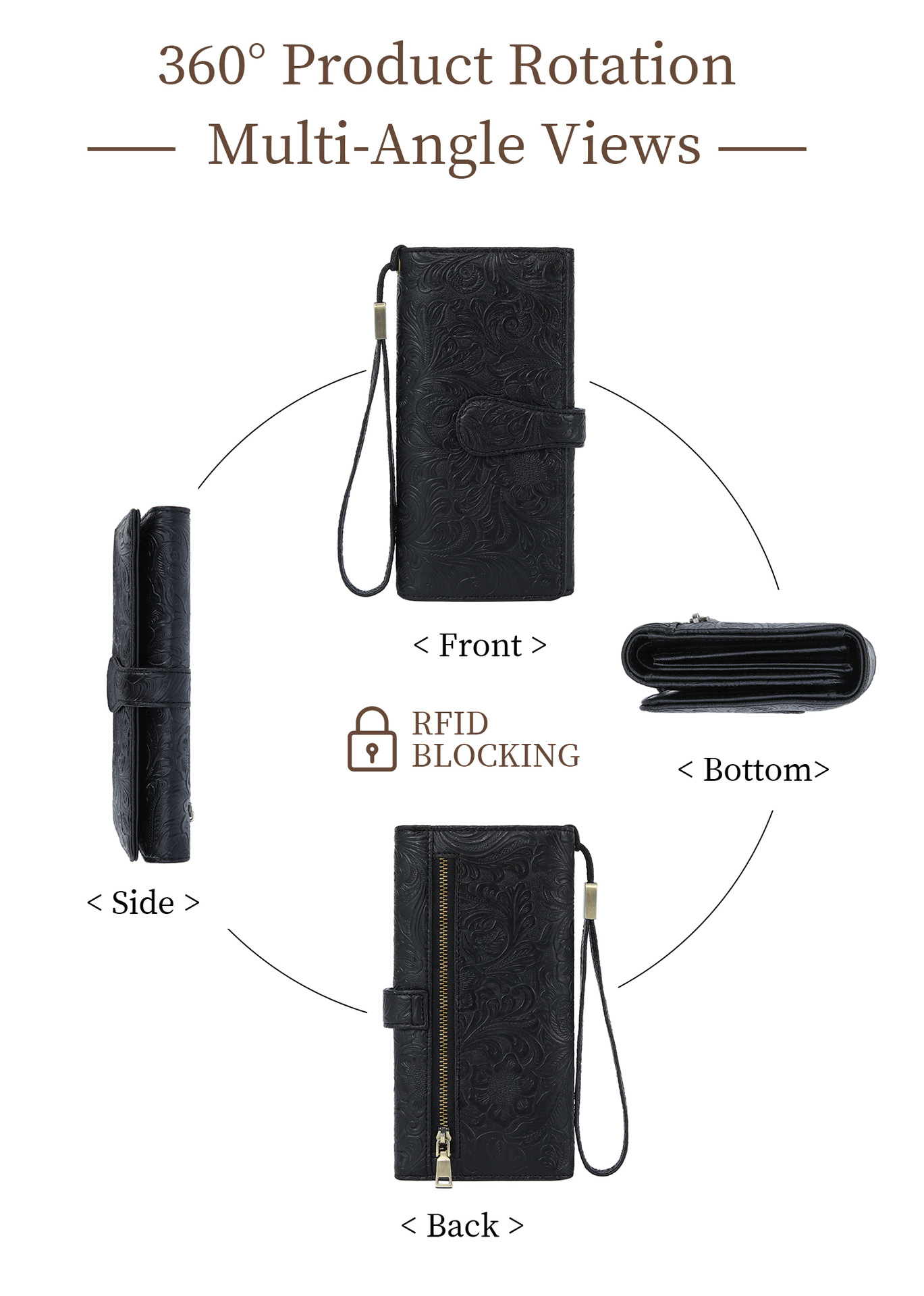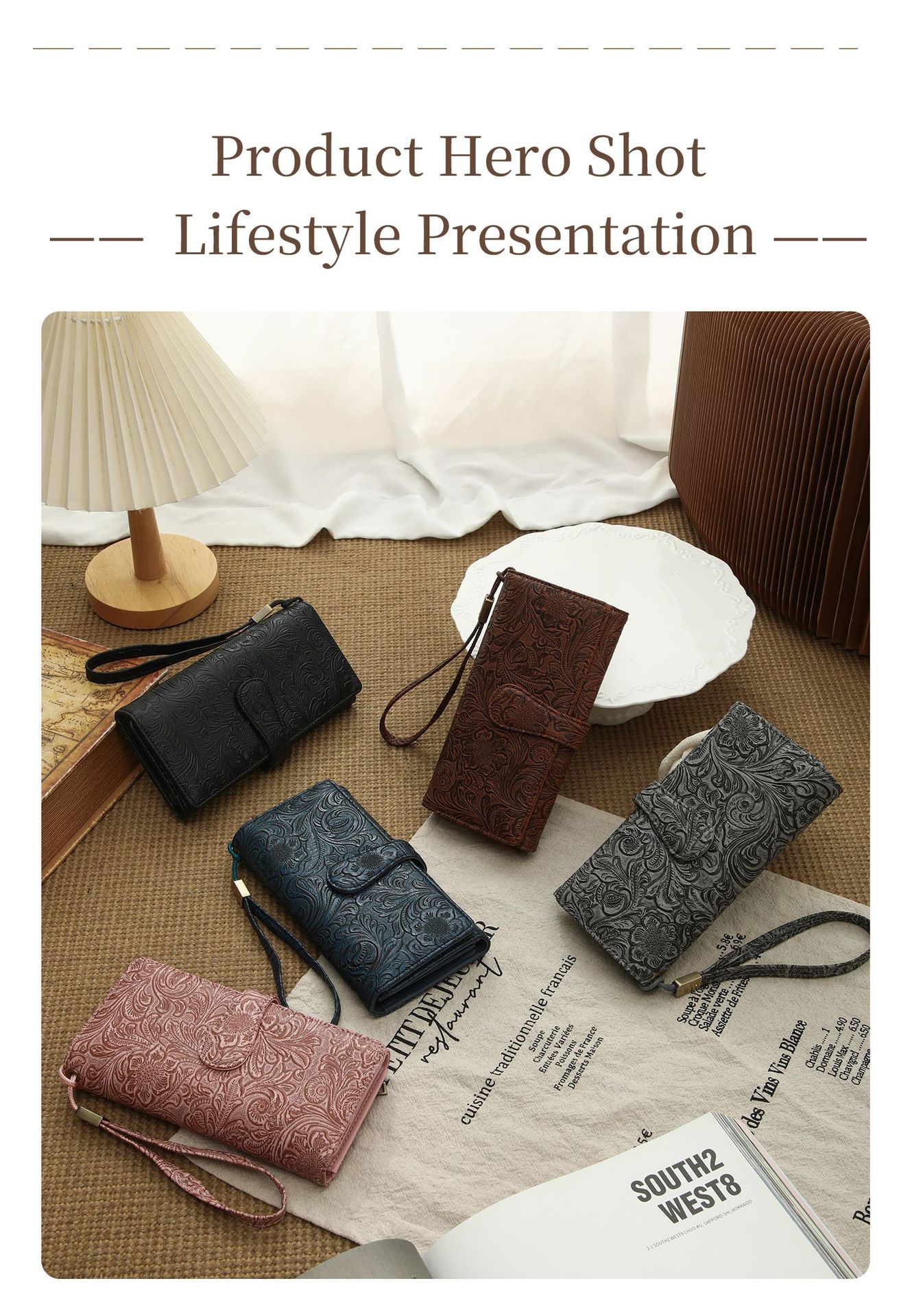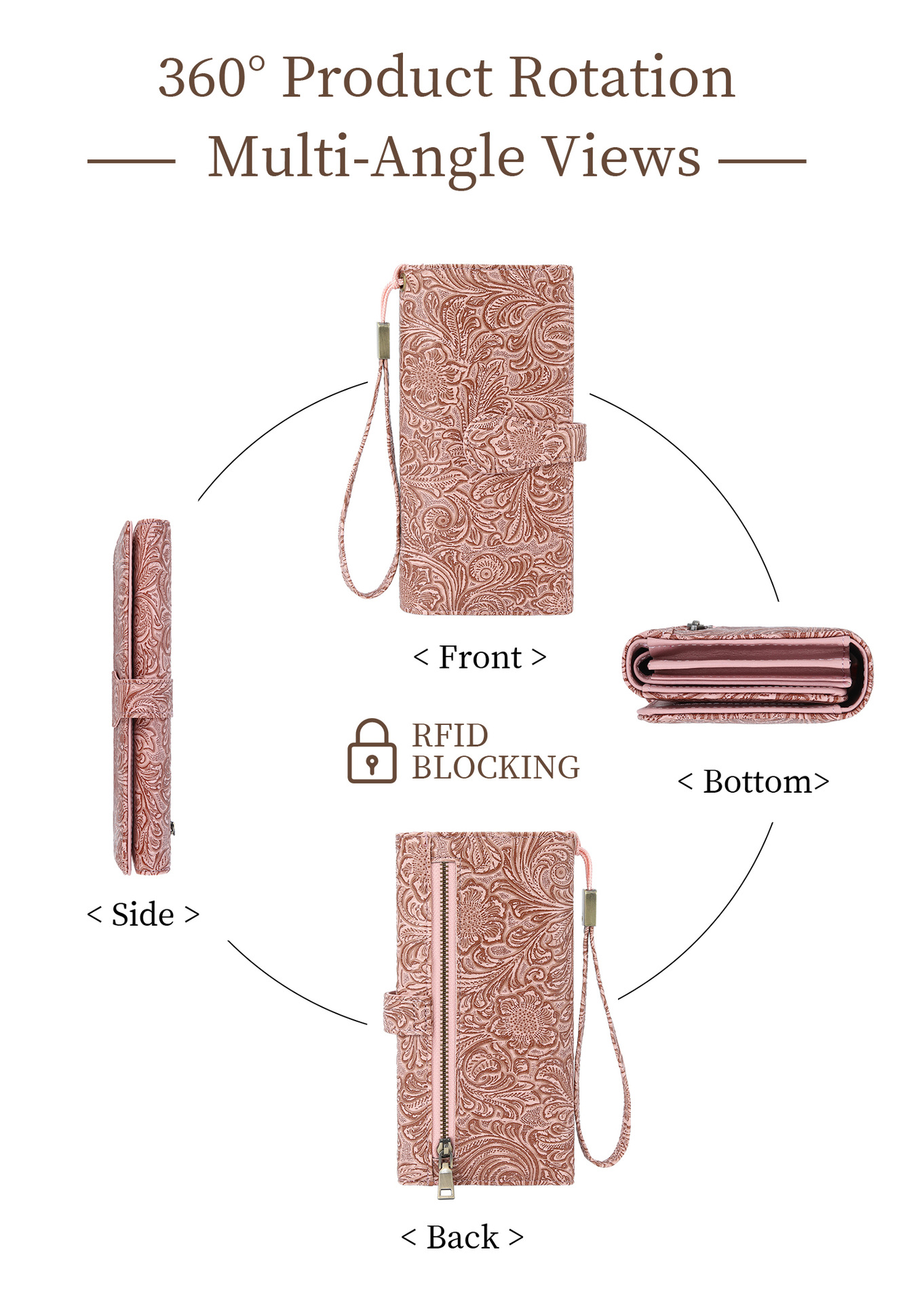 新款多卡位钱包超纤皮革立体压花rfid防盗刷钱包双拉链手机钱包