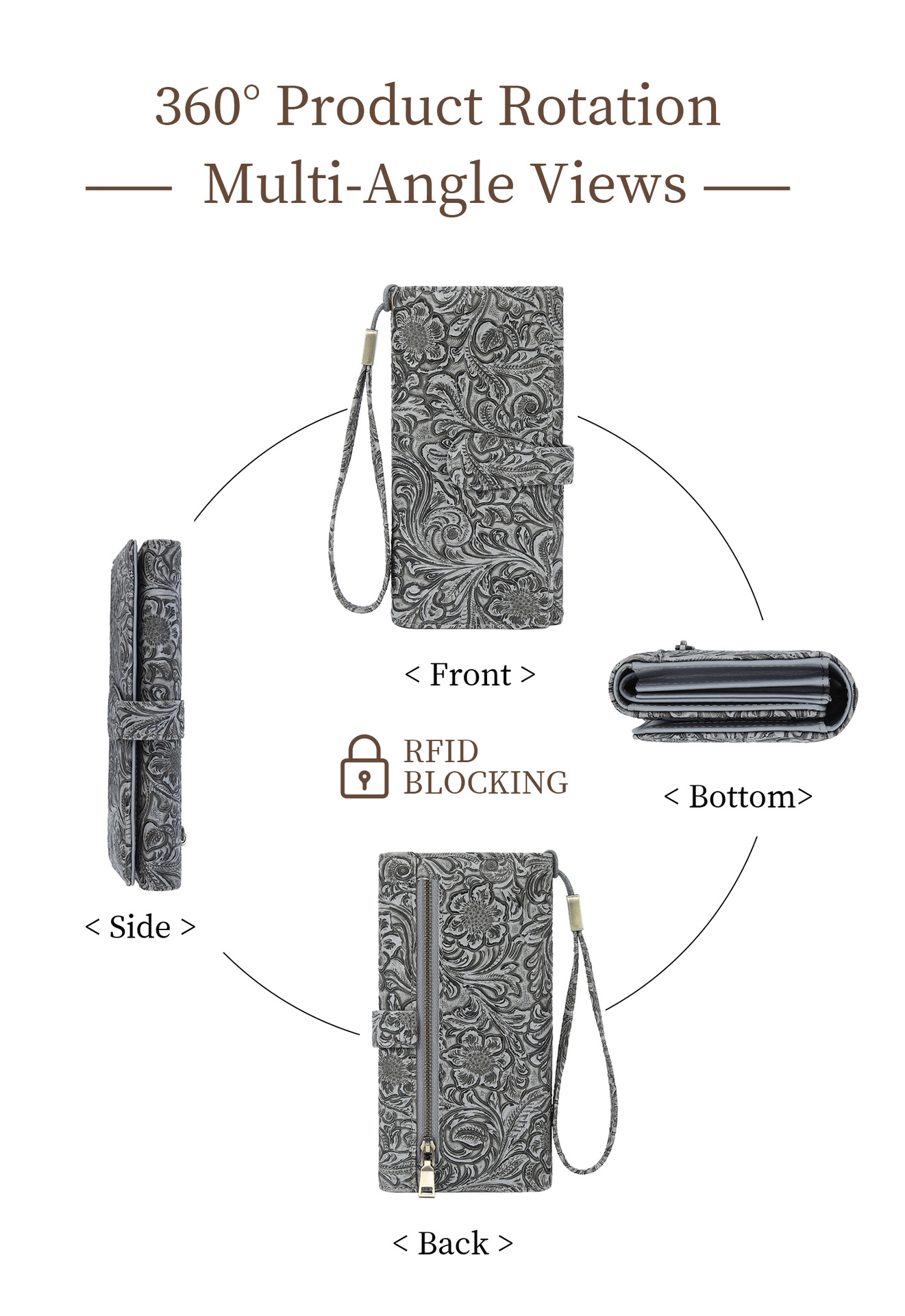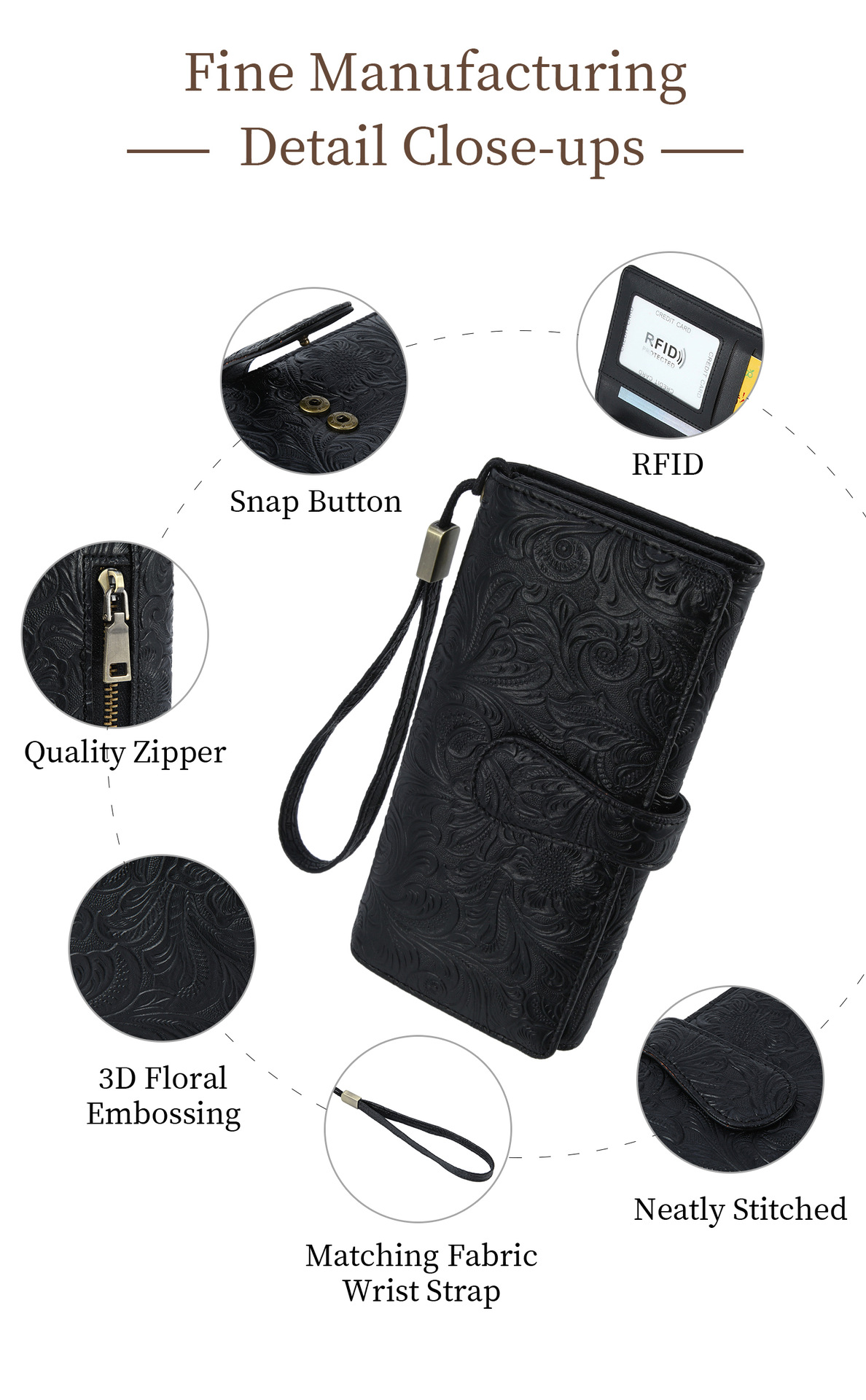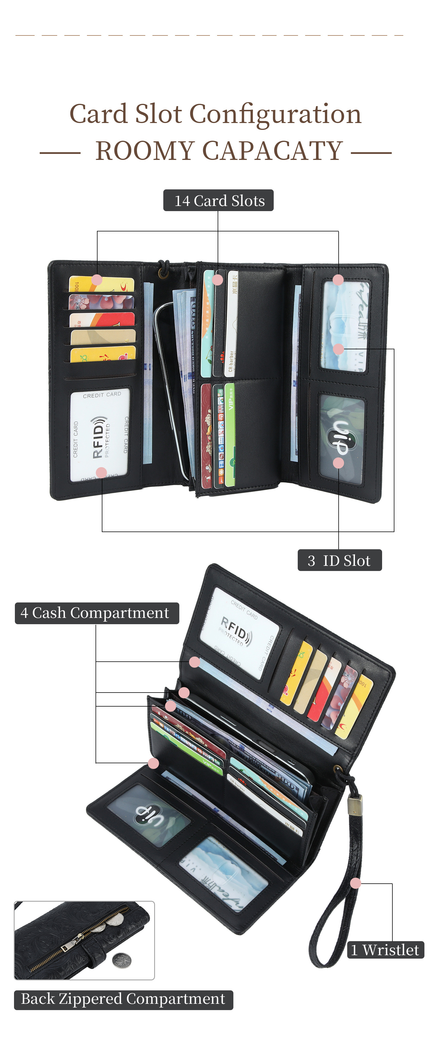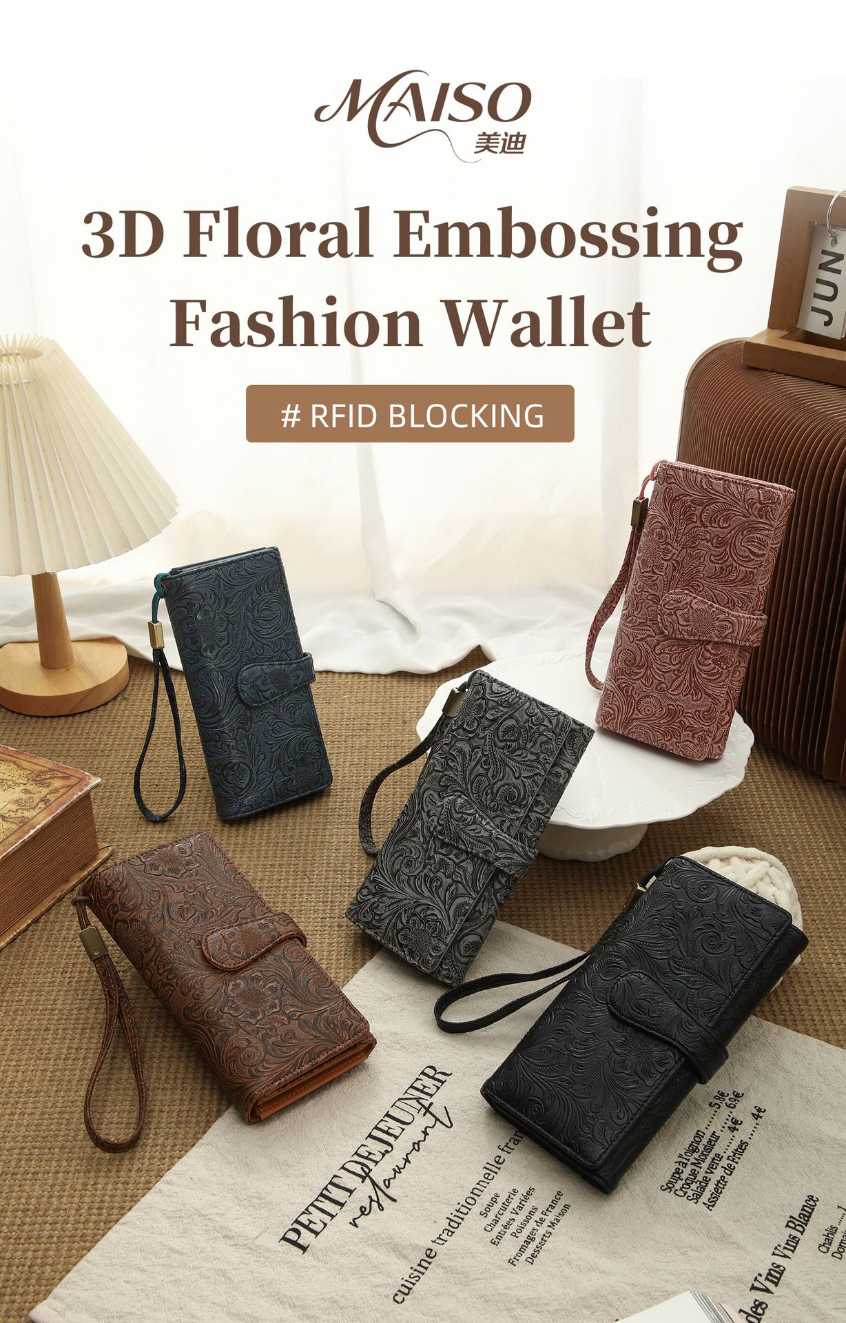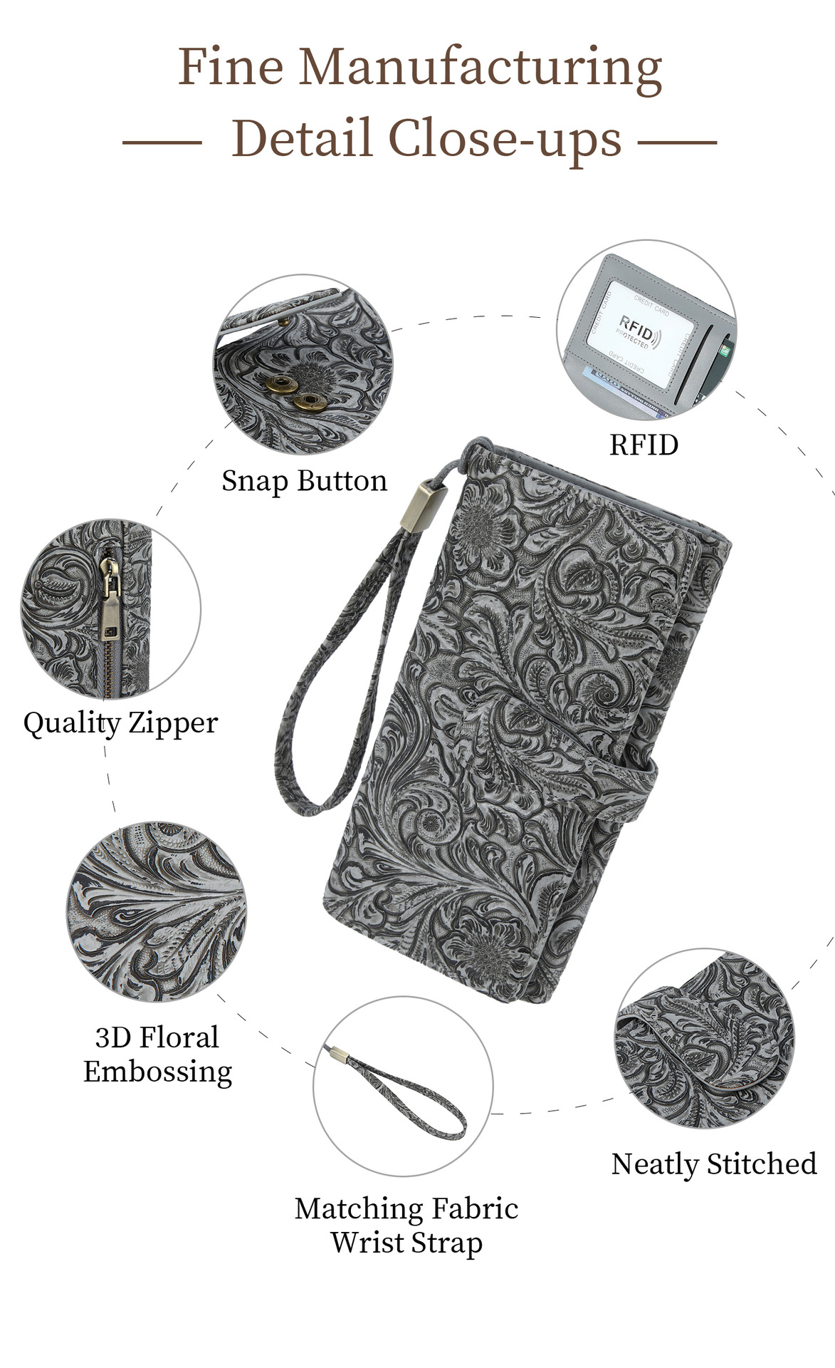 新款多卡位钱包超纤皮革立体压花rfid防盗刷钱包双拉链手机钱包