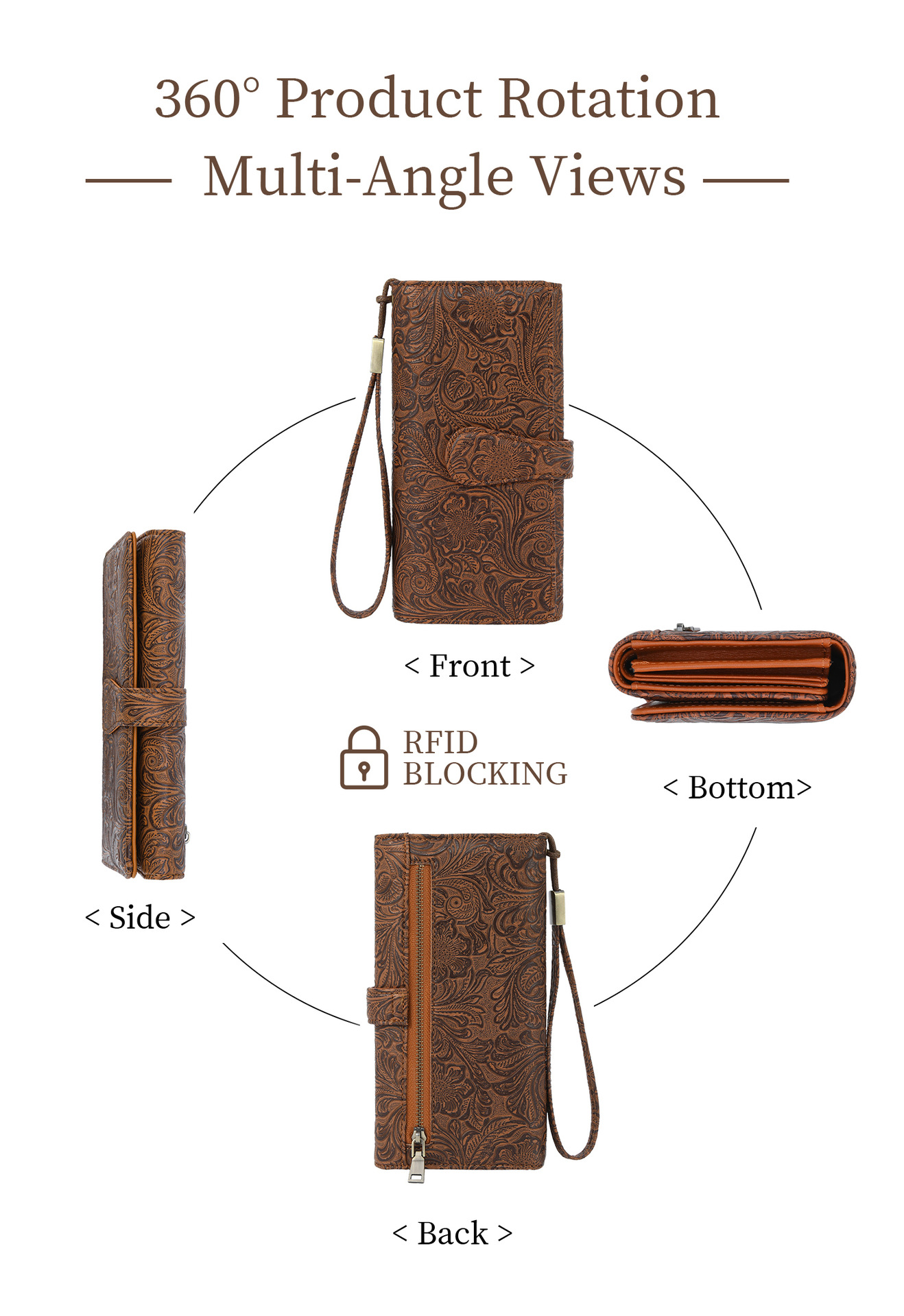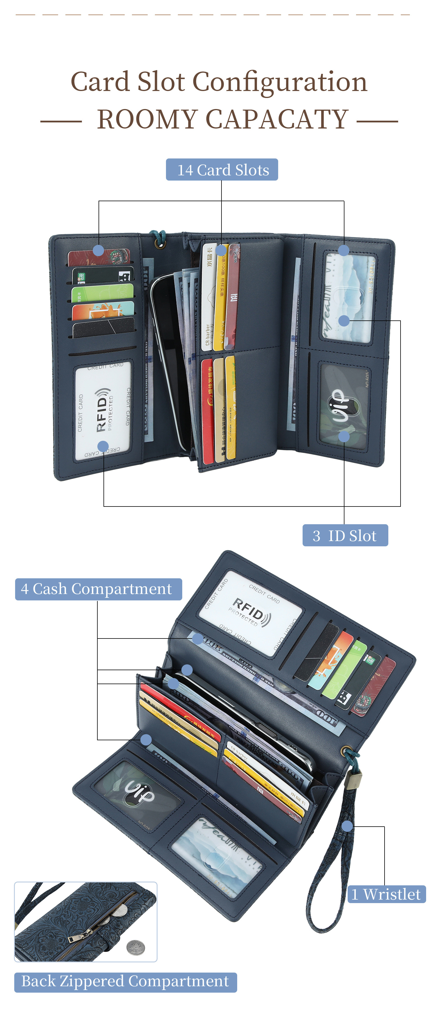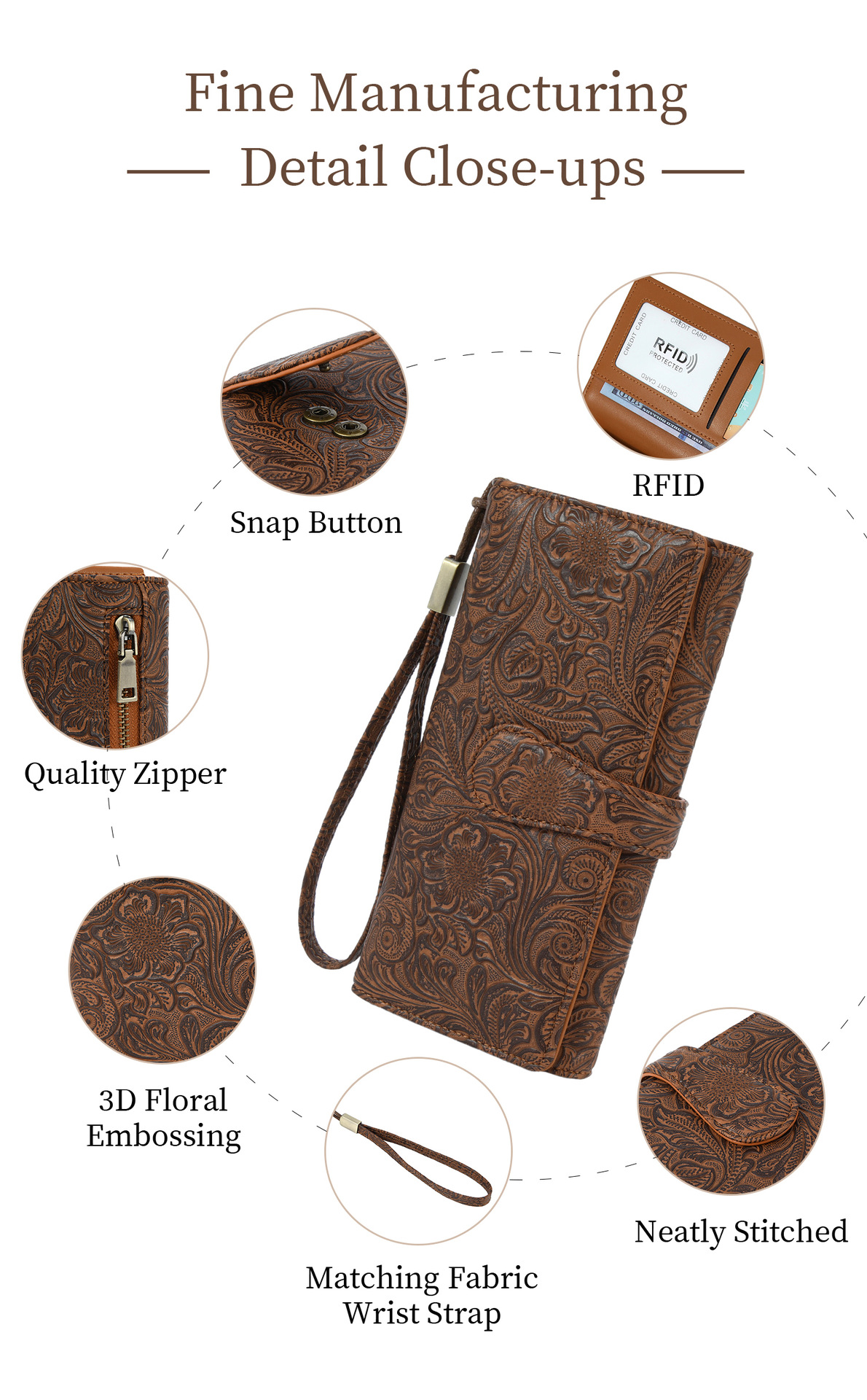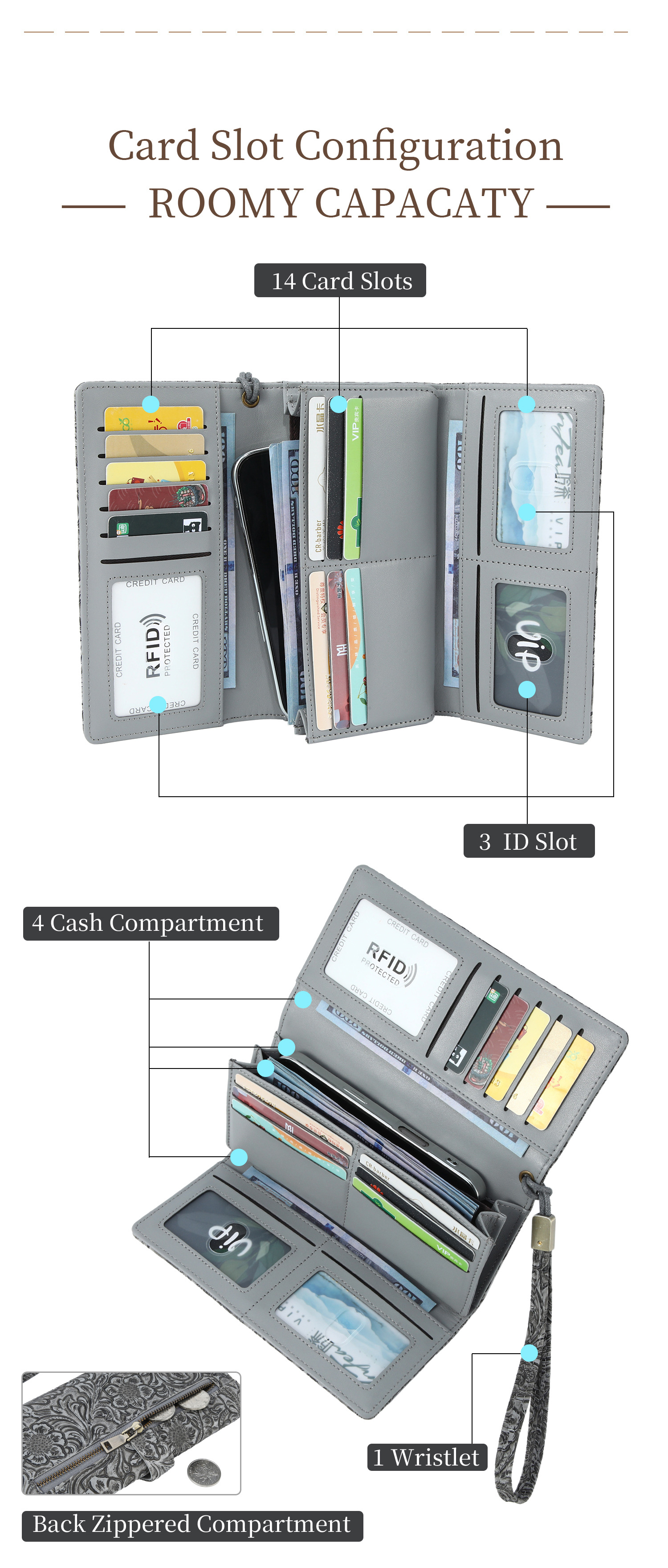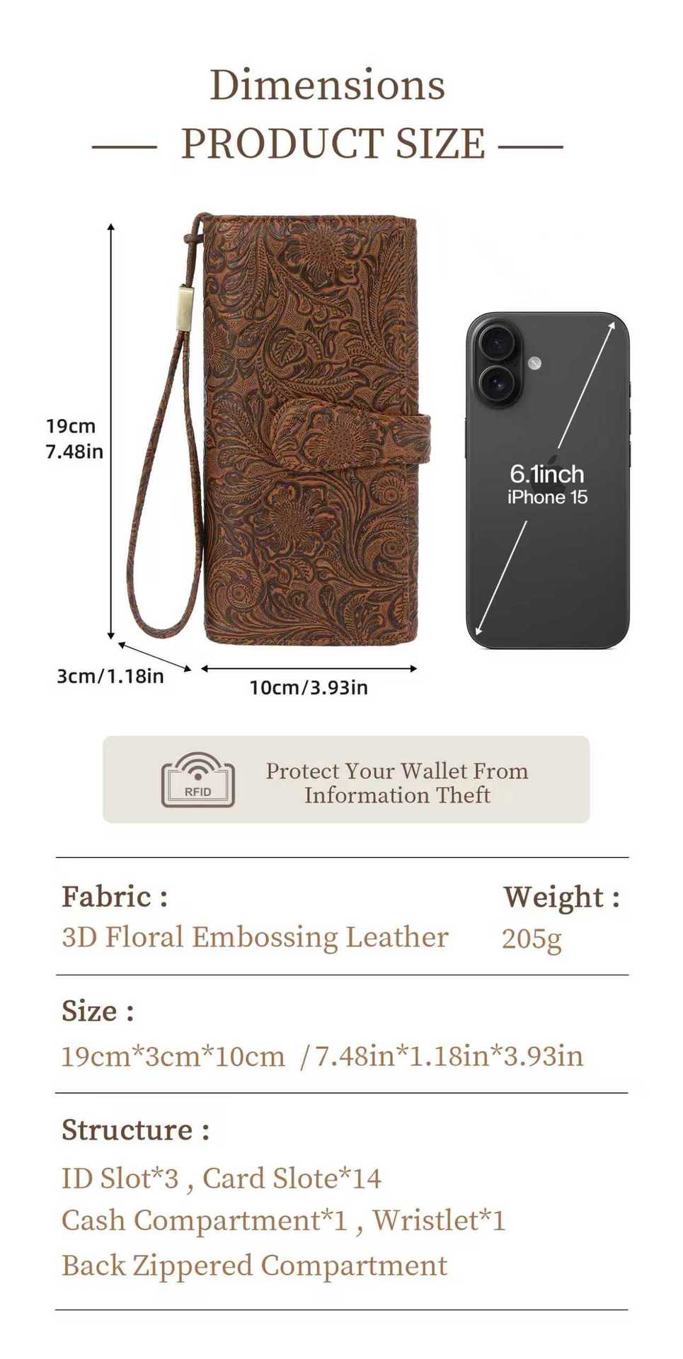 新款多卡位钱包超纤皮革立体压花rfid防盗刷钱包双拉链手机钱包
