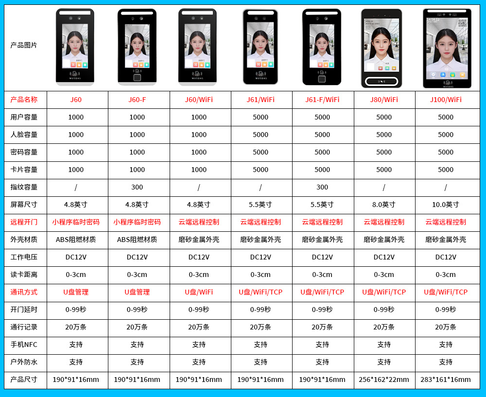 规格 J60(动态人脸+手机NFC刷卡+密码+考勤+触控屏),J60指纹(动态人脸+手机NFC刷卡+密码+指纹+考勤+触控屏),J61(动态人脸+远程开门+手机NFC+密码+小程序+考勤),J61指纹(指纹+动态人脸+wifi+远程开门+手机NFC+密码+小程序+考勤),J80 WiFi(动态人脸+手机NFC刷卡+密码+考勤+触控屏),J100 WiFi(动态人脸+手机NFC刷卡+密码+考勤+触控屏),以下套餐默认发J60 需要其他套餐联系客服,J60 套餐一,J60 套餐二,J60 套餐三,J60 套餐四,J60 套餐五,J60 套餐六,J60 套餐七,J60 套餐八,J60 套餐九,J60 套餐十,J60 套餐十一,J60 套餐十二,J60 套餐十三,J60 套餐十四,J60 套餐十五