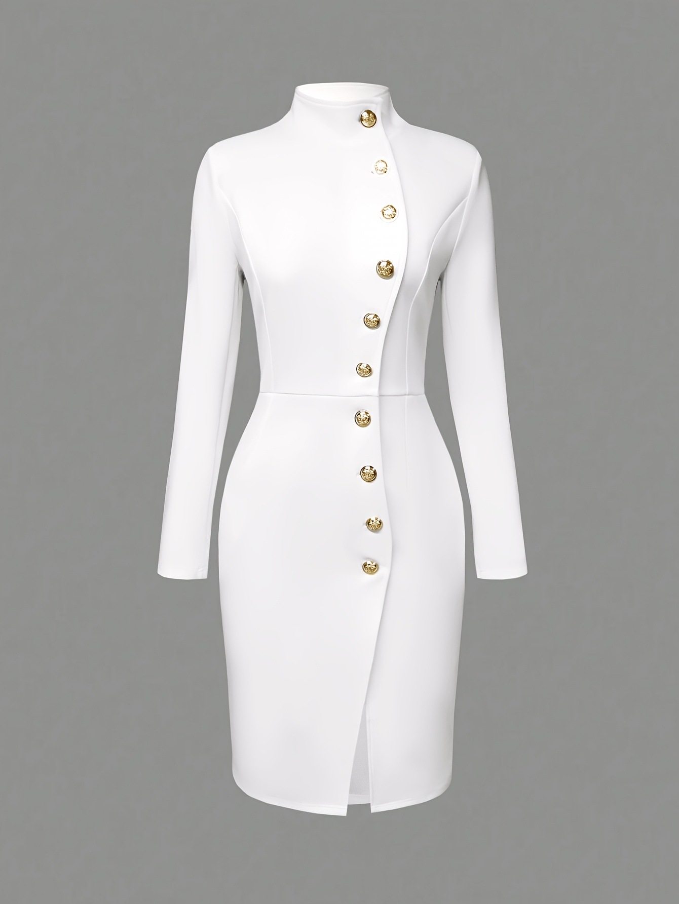 2025亚马逊temu女装 秋季时尚长袖立领修身金属扣开叉连衣裙女