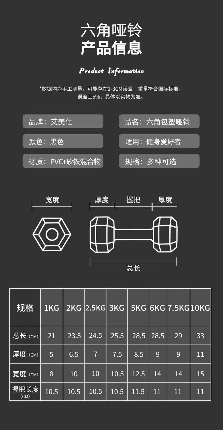 跨境外贸迅迈峰哑铃男士健身家用器材女士5/10KG一对六角黑色环保