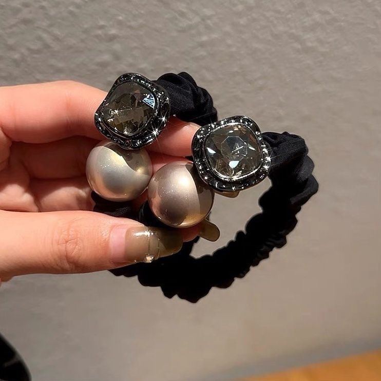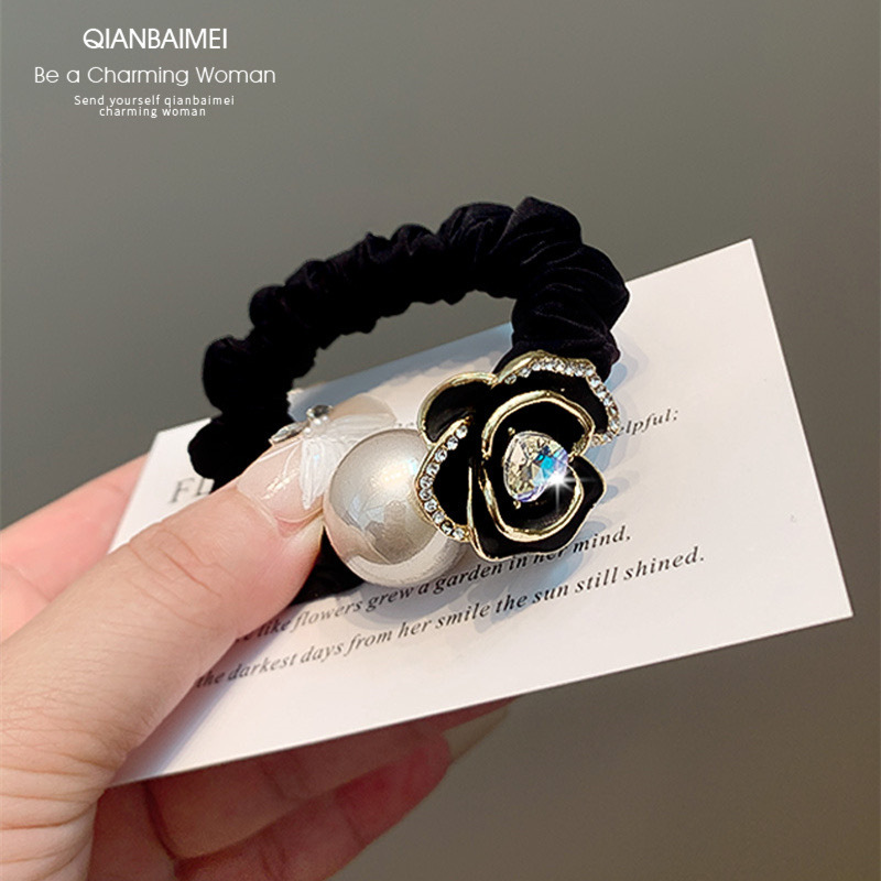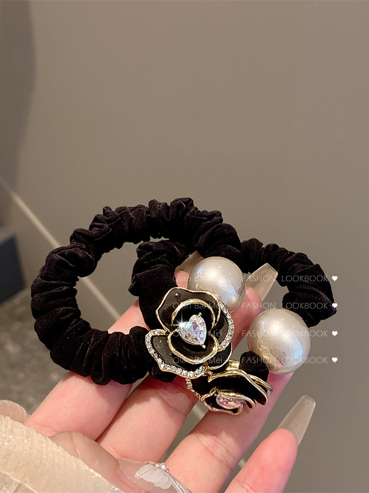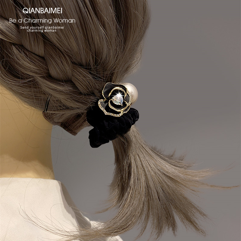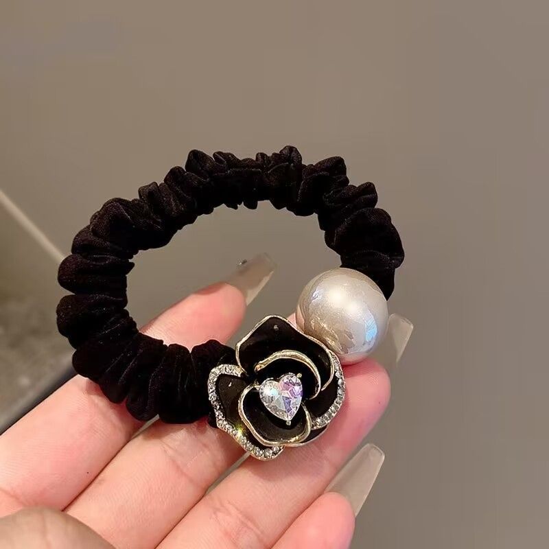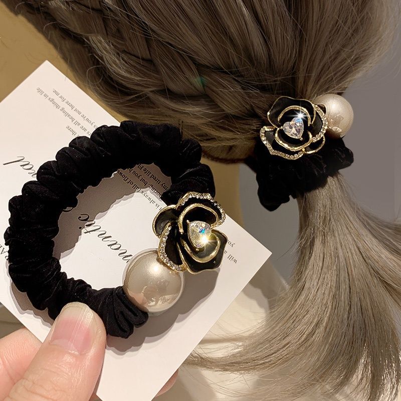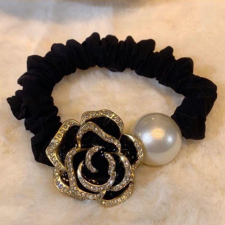 黑色小香风发圈女扎发皮筋山茶花珍珠闪钻肠圈高级感头绳气质发绳