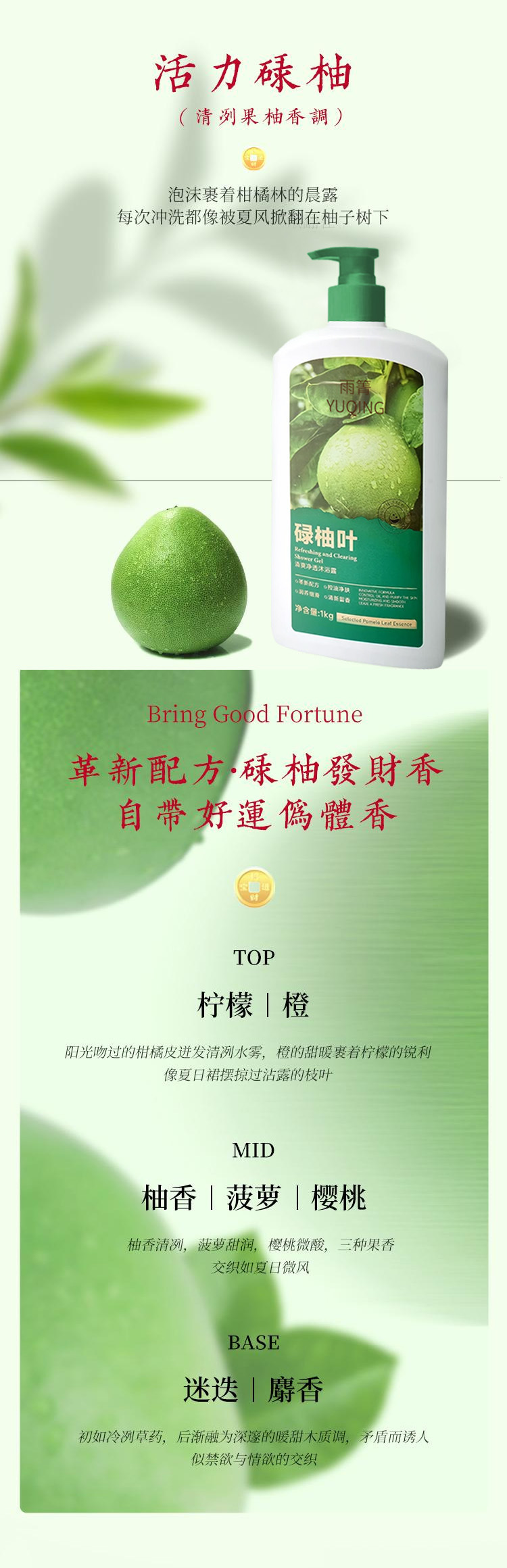 雨箐碌柚叶清香净透柚子叶芳香好运水润清爽沐浴露厂家现深层清洁