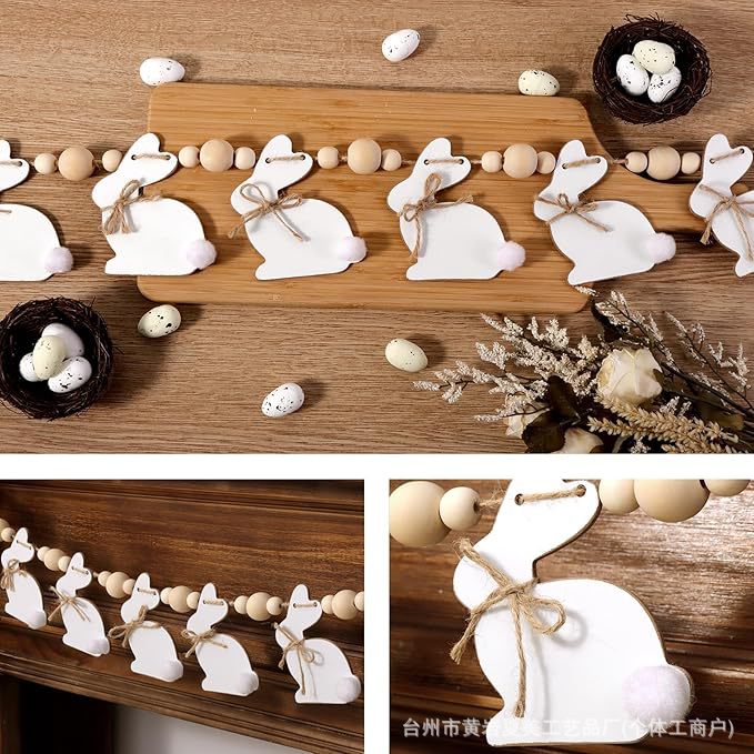 新款复活节兔子木质拉旗创意木珠串麻绳串珠diy家居墙壁挂件吊饰